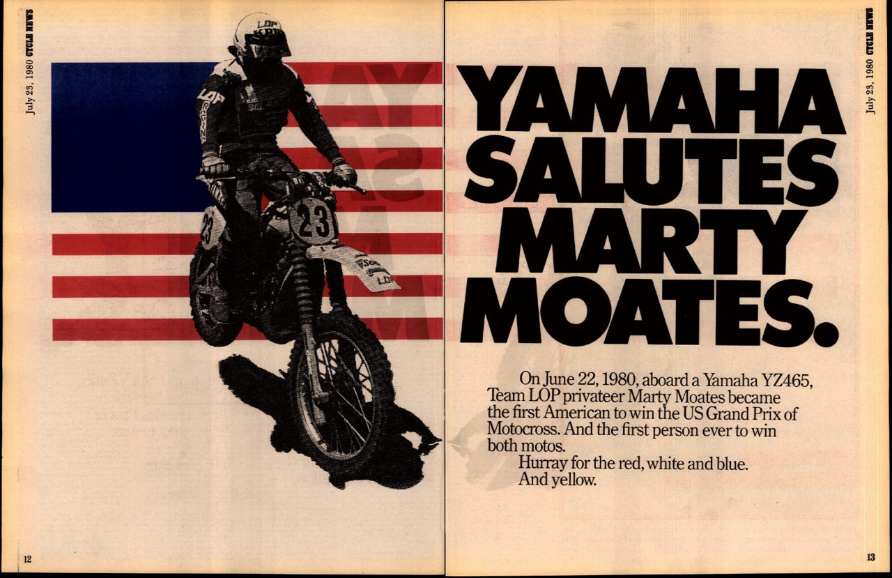 Interestingly enough, the bike that Marty Moates holeshot both motos with and won on in the 1980 Carlsbad World Championship GP had a stock 465 engine that his sponsor LOP Racing highly modified with a custom cylinder and stroker crank to make it a 490, but they didn't tell anyone this at the time. The reason they didn't tell anyone may have been that Yamaha might have asked them not to, because Yamaha wanted people to believe that it was just a 465cc engine so they could ride the wave of Moates win and sell more 465's, which they manufactured in 1980 and 1981, but that is just a guess. Unfortunately, when Yamaha decided to make a 490 for 1982, they must have lost LOP's phone number cuz the one Yamaha made is not nearly as good as the one LOP made.