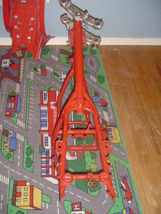| ...another shot of the frame to the right. The frame pics were taken in my sons bedroom because I was storing the frame in the attic which has the door in his room. The triple trees pictured are no good to me on this project because they are from a '84 200x and I'm putting a complete '85+ front set-up on this frame. |