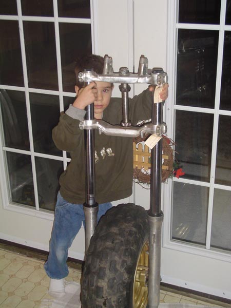 | I was never sure the 1985 front forks would work. I test bolted them up and it looks like a perfect fit! My wife was gone with the kids for a few days so I can play with toys in the living room like a bachelor. |