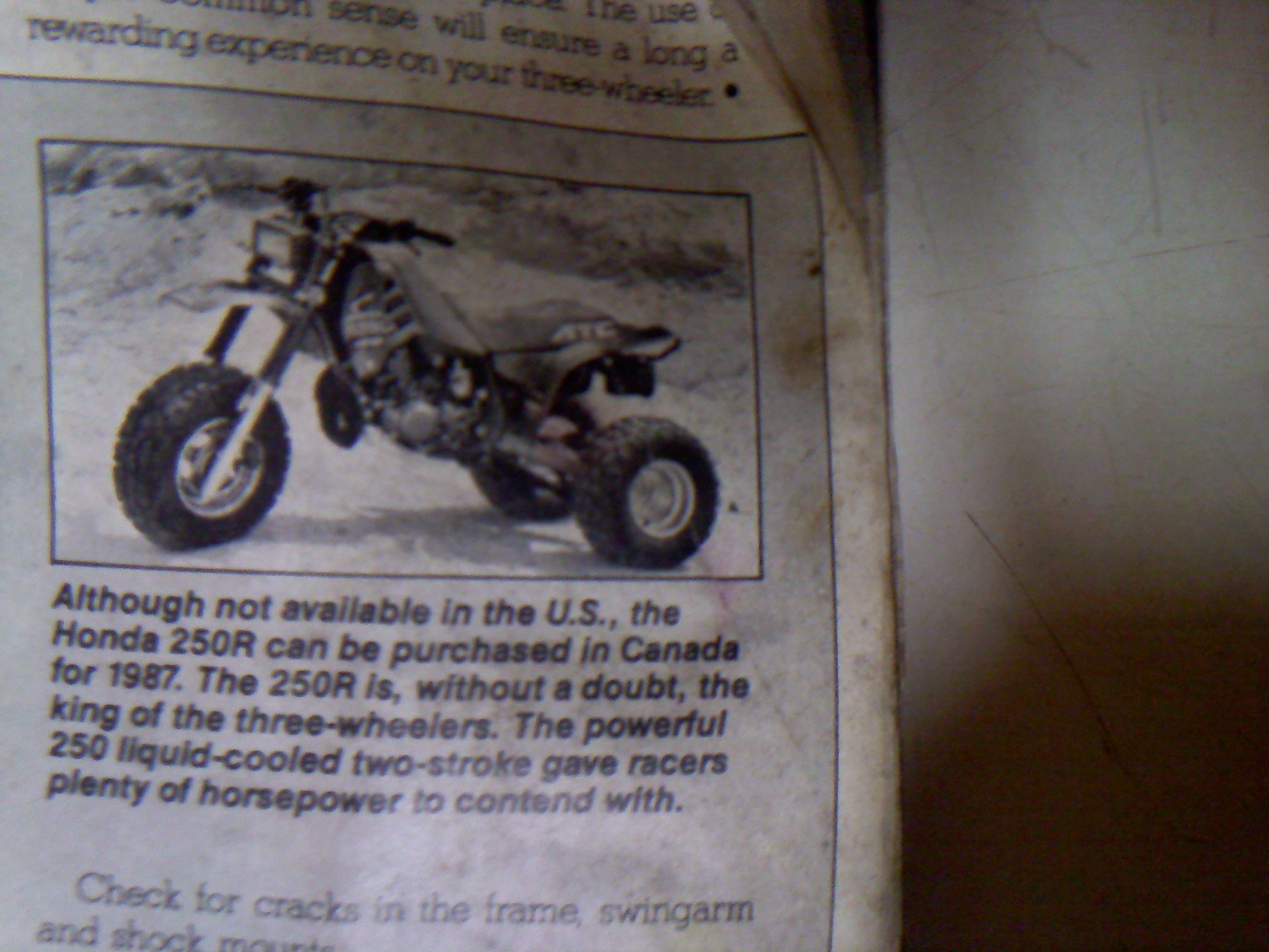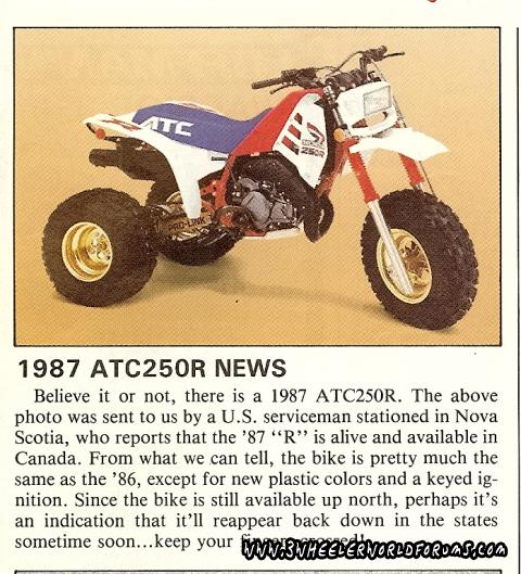 Before the consent decree went into effect Honda had already released shipments of some of their 87 models of ATC's ....So there were a few dealers who were lucky to have them on their showroom floors....The way it was interpreted by the dealers when the consent decree went into effect they could no longer order three wheelers but could sell what they had on the showroom floor....That is why you see some 87 models floating around out their..NO 250r ATC's Had been released by that time..ALL 1987 ATC's that were in Honda's warehouse's were taken and dismantled at the warehouse. Any parts that did not have a serial number on them and would interchange with previous models were returned to stock ...Since the engines all had serial numbers and it was not profitable to have the engines dismantled the dealers were asked to contact the local schools and colleges and donated the engines to the automotive programs (You can imagine what happened)....The frames were cut up on site at all of the warehouses....I personally was at the Meico warehouse in Carson California picking up a shipment of Quads when this was going on.....Security was as High as on a Military Base....There were armed guards everywhere...And out in the parking lot next to the roll off scrap bins were a bout 20 guys with cutting torches,,,,cutting up what looked to me to be 200x and 250r Frames into 1 foot pieces..It was really sad..I was sad because i knew it was the end of an era....The take off wheels and tires that came off all the different models were sold to the dealers for insane prices...I think I bought a pallet of 200x take offs for 50.00 a pallet...And 250r takeoffs went for 75.00 a pallet......IMO I really doubt that ANY 87 250r's exist...again security was insane and Honda was taking NO chances as this had already cost them and they did not need another lawsuit. From the retail side of Honda ATV's this was the end.....I doubt if my lifetime I will ever see anything like this again for the ATV market.....At the heyday of ATC;s it was not uncommon to see 25 ATC's roll out the door a day....Because of the Consent Decree Honda also pulled out of all ATV racing by 1989....Thus no TRX250r models for 1990..Honda had received the brunt of the Consent Decree and since their Automotive sales (Civics and Accords) were selling very well over here why take a chance on ATV's?...Personally this whole thing was caused by irresponsibility of riders and the sad part is it still continues today....But I am shocked but happy as being one who personally saw all of this happen that Three wheeler racing is happening again....Three wheelers were banned from all the tracks I raced on as no insurance company would touch and event at that time that had three wheelers.....As a side note AGAIN Honda's release date had not come up yet even though the 250r ATC's were in the warehouse's...So I really think the chances of finding one are none......I will be happy to answer any questions as I realize some of you were probably too young to even remember this.....You have to give me a break though as this is my busy season for my business, but I will get back to you....