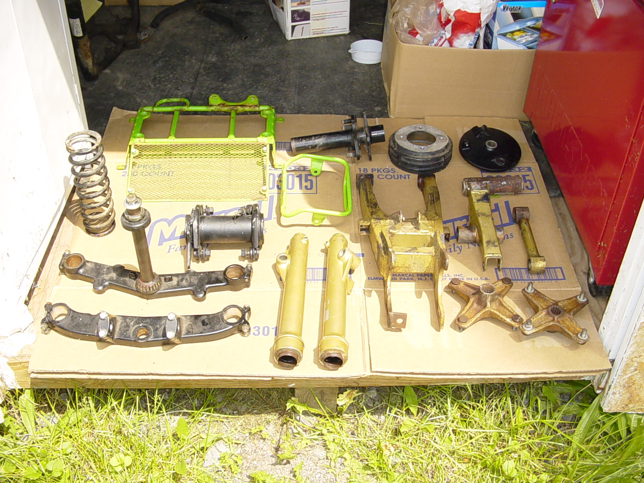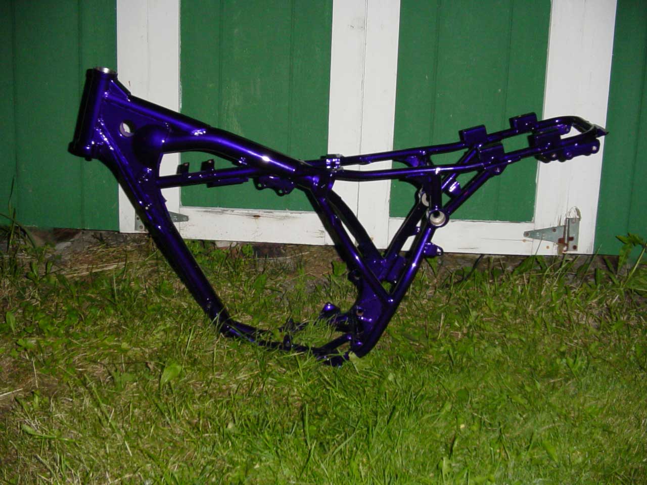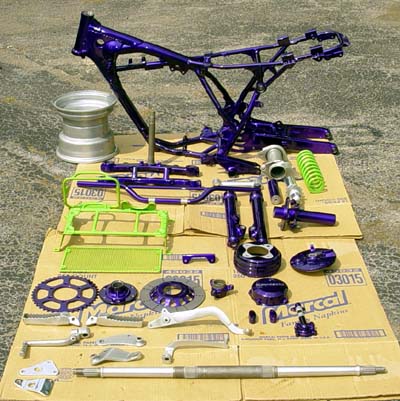 As you can see Im totally torn down. As I write this my Tecate is getting Powdercoated and polished at Sumax here in NY. They mostly work on Harleys but were excited when I told them what I wanted. They do only show quality work. www.sumax.com Ed Note: I believe these are the same people who powdercoat the motorcycle parts on the show "American Chopper" Anyway I should have all those parts in the pics in about a week. Im hoping to have a rolling chassie by September. I dont work due to a busted up back so it takes time to get the cash. By the way for all of those parts in the pics, it only cost me $560.00 Thats 3 colors Califorina Grape, Tecate green with gold flake and chromium with gold flake. This thing is gonna look fast sittin still. Ive lugged this Tecate around for about 8 years and everytime I got it going something went wrong so I said screw you and tore it down for the complete job. Electrical, liquid cooling, top end, and Sumax is trickin out a few engine p! arts with the Grape and polish. All the suspension will be rebuilt as soon as I get my parts back. So far I got about $1200 into her and I need plastic, tires, and some stainless nuts and bolts.I figure around $1500 when finished. Then its up for sale. 8-04-03 Well I got my parts back from Sumax today, and man I allmost lost it. They had everything wrapped up, so all I could see was the frame. I did 80 mph all the way home, and started unwrapping. Holy Hindu! This stuff is show quality. Im liking the color scheme, and in the sun the Tecate green and chrome Powdercoat with that gold flake is Sick. Well I wrapped it all up to go build it so I will give you all a teaser. He He. The frame is Powdercoated Califorina Grape, but I took this pic at night so it looks kinda blue. IT'S ALIVE!!!!!!!!!!!!!!!!!!!!!!!!!!!!!!!!