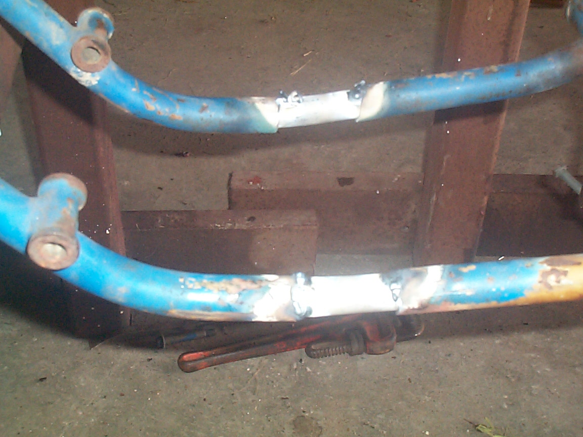 This is the Pipe that will be going inside the tubing on the frame. The Initial Idea for splicing the Frame is to take these peices, and put them inside the frame tubing. Weld them to the frame. Then take another peice of tubing big enough to go around the frame, splice it in half, cut a v in each end, and then weld it all together. Should be quite a big stronger then the original frame when all is done.