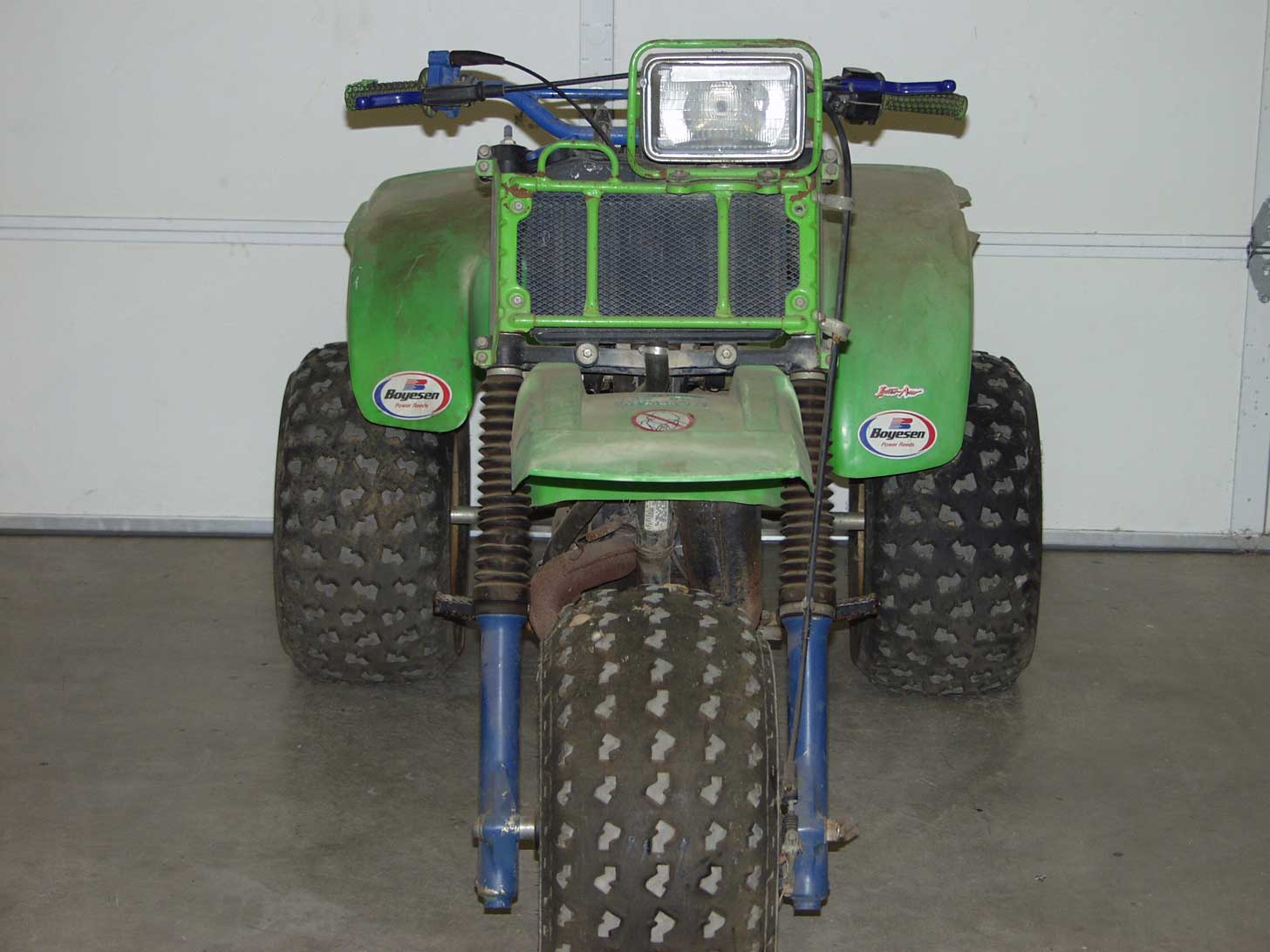 '84 KXT250A1Here are some of the highlights. Stripped and sandblasted the frame, swing arm and anything else that was previously painted black and painted it metallic silver. Engine case covers and front forks were sand blasted and polished. The fenders and tank were so oxidized by the sun, I had them painted. Exhaust system from BILL'S PIPE (replaced fiberglass packing). Polished aluminum rims from Douglas Wheels. Custom upholstered seat cover. The stock tires were still good, so I kept them. New flywheel and stator from Ricky Stator.com Installed Boyseen reeds. K&N filter with precharger. New rear shock from Works Performance will arrive on September 25, 2003. New Fuel Petcock Valve. Rebuilt top end (only installed new rings, Piston and cylinder was in great shape) New aluminum grab bar from PRM-ATV.com New LED rear tail light. The Paint Job was done by my Father-in-law who is a Contract Painter. He often does work at Disneyland and California Adventure. This has given him some expertise in painting unusual surfaces like the fiberglass coated hand rails at Indiana Jones adventure ride to make them look like Bamboo. He also has painted Tomorrow Land, Space Mountain, Aladdin's Oasis and more. With this plastic He washed the plastic with soap and water. Lightly sanded with 400 grit sandpaper. Applied "Plastic Prep" from DUPONT. Then used Automotive Plastic Primer (Same that is used on Painted Car Bumpers) Then Used Spray Can green paint from AutoZone (High Temp Exhaust paint/Color-Grabber Green) Then used Emron Automotive Clear coat. In all this restoration set me back about $1100.00. This bike runs great and sounds strong, I have only taken it out for a short ride down the street. The first Glamis trip will be October 11, 2003. Then I will really find out it my investment has paid off. Great Web Site, Three Wheelers forever. Abolish the Consumer Product Safety Commission. Terry Hammon Bermuda Dunes, Ca. |