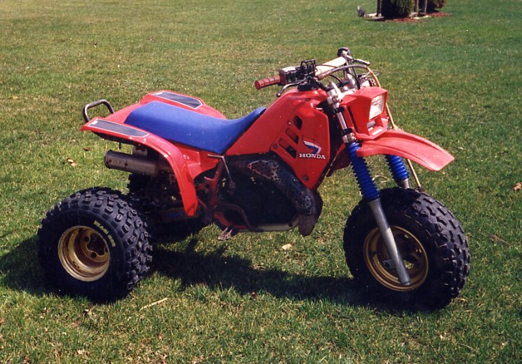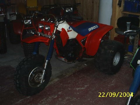 It has a K&N filter with a hole-sawed airbox lid, Supertrapp exhaust, rejetted carb and original Honda 350X tank decals. It has a 200X style front tire.