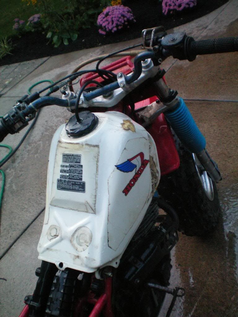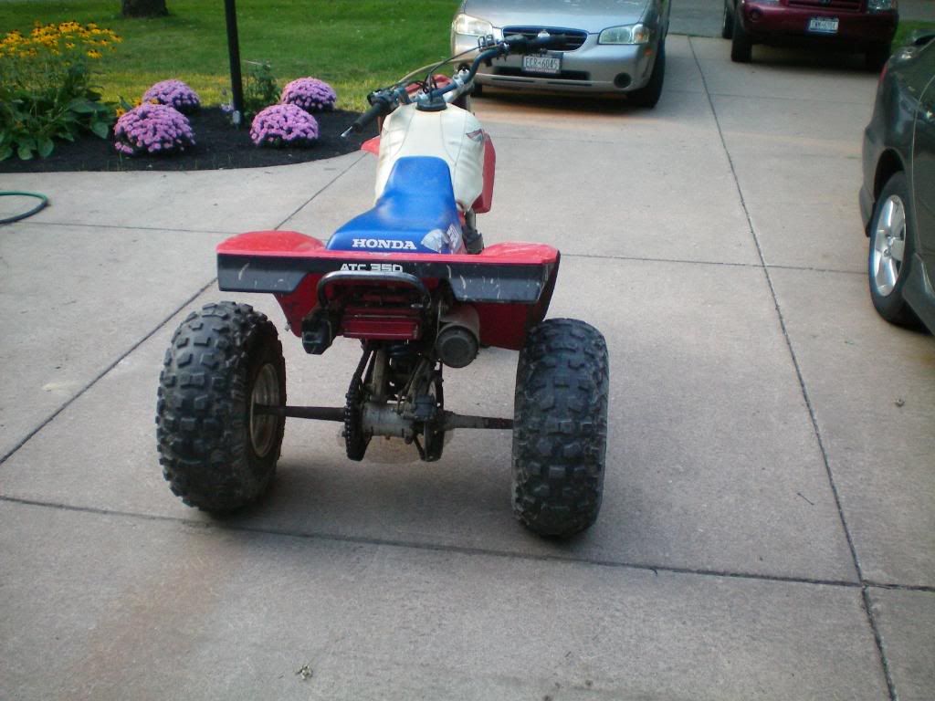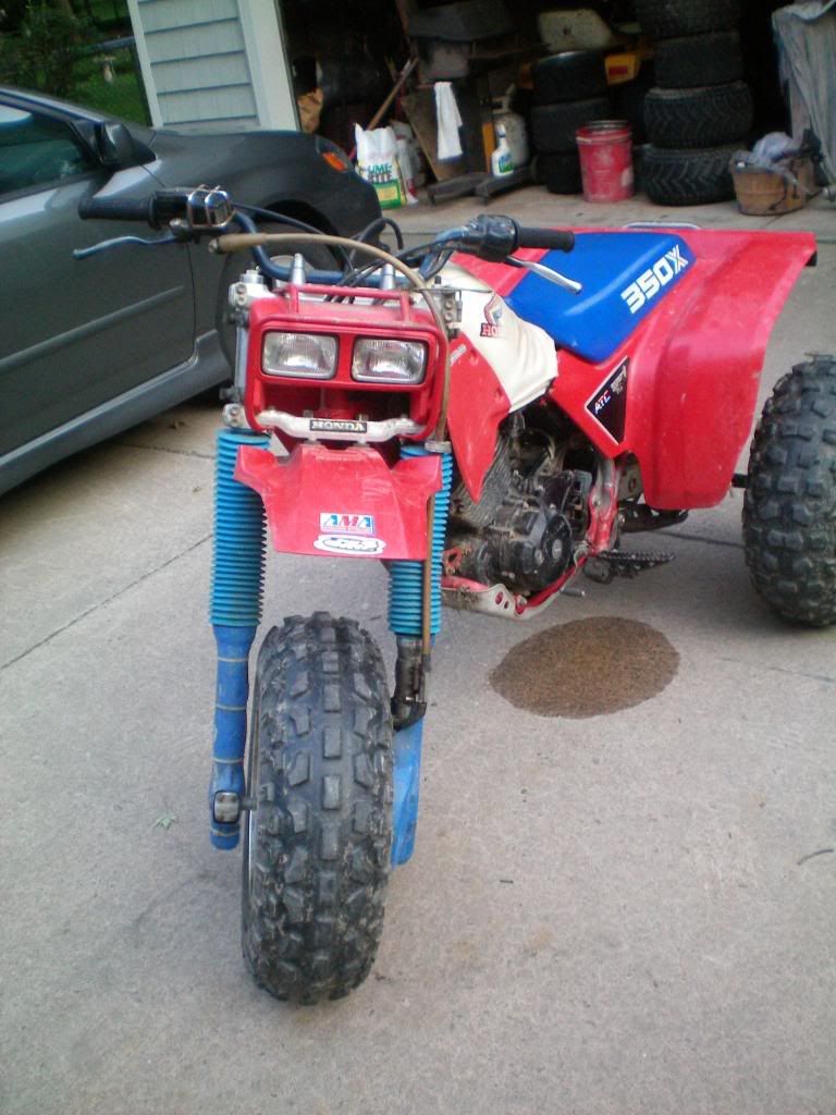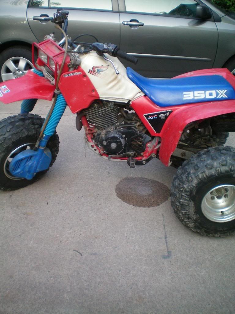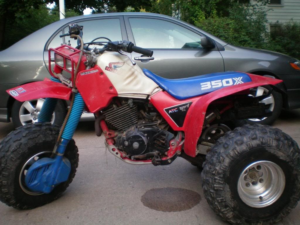 So Jeff (honda250sx) found an add on craigslist the other day for a 350x not far from my house. The 350x being the 3 wheeler I have dreams about, i jumped on it. I noticed the date was from end of august and we are in september and was skeptical but i had nothing to lose. I called the number several times with no luck until I emailed the guy and asked him what was going on. He put up the wrong number and gave me the right one, thus he still hadnt sold it. Called him, went down and looked at it and bought it. He is about 67 years old and the origional owner, bought new. His son used to race it. It has a twist throttle and supertrapp exhaust. Maier superscoops and a CEET tank cover(??). Does anyone know if any of this stuff is rarer?? Like the plates, or the scoops or cover? Came with a basket of extra parts, orig tool kit**, number plates, extra swinger and shock, dead mans switches, tires on rims galore. I have not gone through everything yet. It hadnt run in 4 years and the carb needs cleaned. The pet cock on the tank doesnt work (doesnt turn the fuel off). But it has LOTS of power. On the origional bore still and it is nuts!! Oh yea, and it came with the owners manual and title to. Anyway i will have alot of questions so i hope you guys can help. He wanted 1500 and i talked him down to $900. I think i did ok. Ok here are the pics... THere are alot because i know we like pics...