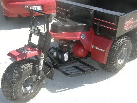 My buddy has a old Sasquatch and it looks exactly like what we use to have except 2 extra wheels in the back. Steering looking the same, foot rest were exatcly same, motor was same 340 motor made by same company, even square tube frame looked the same. So think that's a start to find out what it is. It's same layout as the Gator, belt drive, gas tank towards the back. It was 2 wheel drive (front 2 wheels) and with the press of a foot lever, it engaged a coupling in the farthest axle (took a sec to line up), locked the 2 together and made it 4 wheel drive. Thinking back about it, I think it was 4wd full time but the foot lever made it a locked 4 wheel drive. It even had reverse. Which probably necessary on a machine that big with a dump box. Had twist throttle. Front suspension.