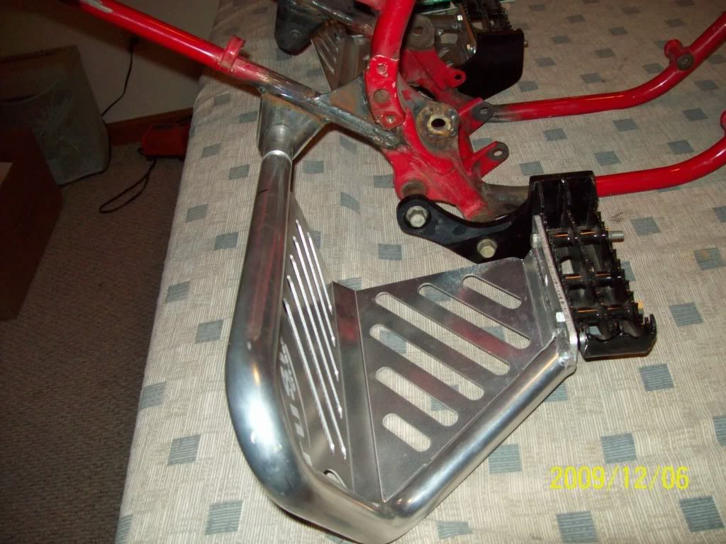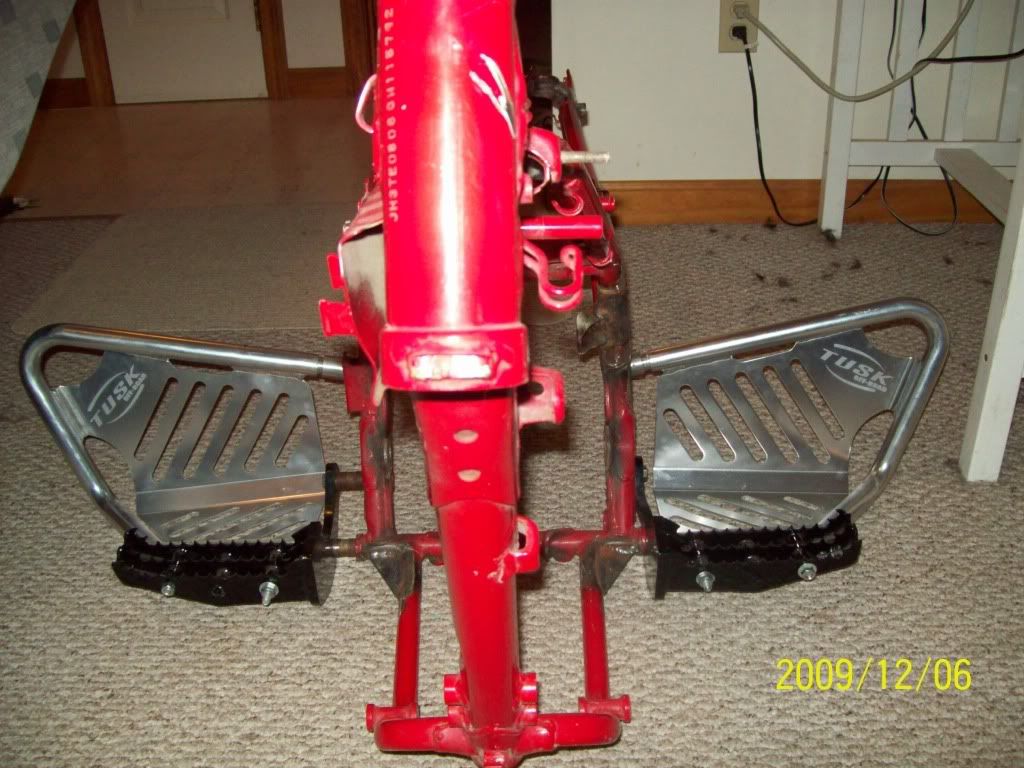 I believe HRE made the "death" footpegs and IDK what model the TUSK guards are for but I chopped off all there mounts and made some in my lathe so they would be uiniform and appear like they were meant to be there. I don't have a TIG and the owner knows he'll have to get that portion fitted but I have the rest down and done. 5 minutes with a good Tigf welding guy for 6061 aluminum and he's golden