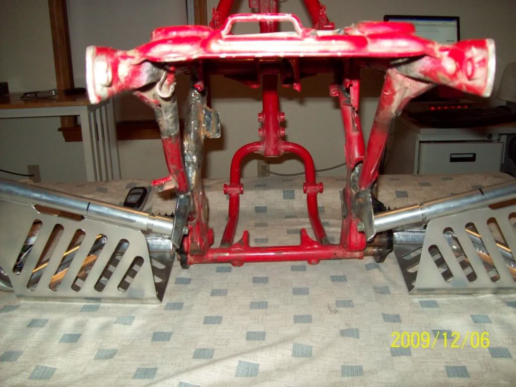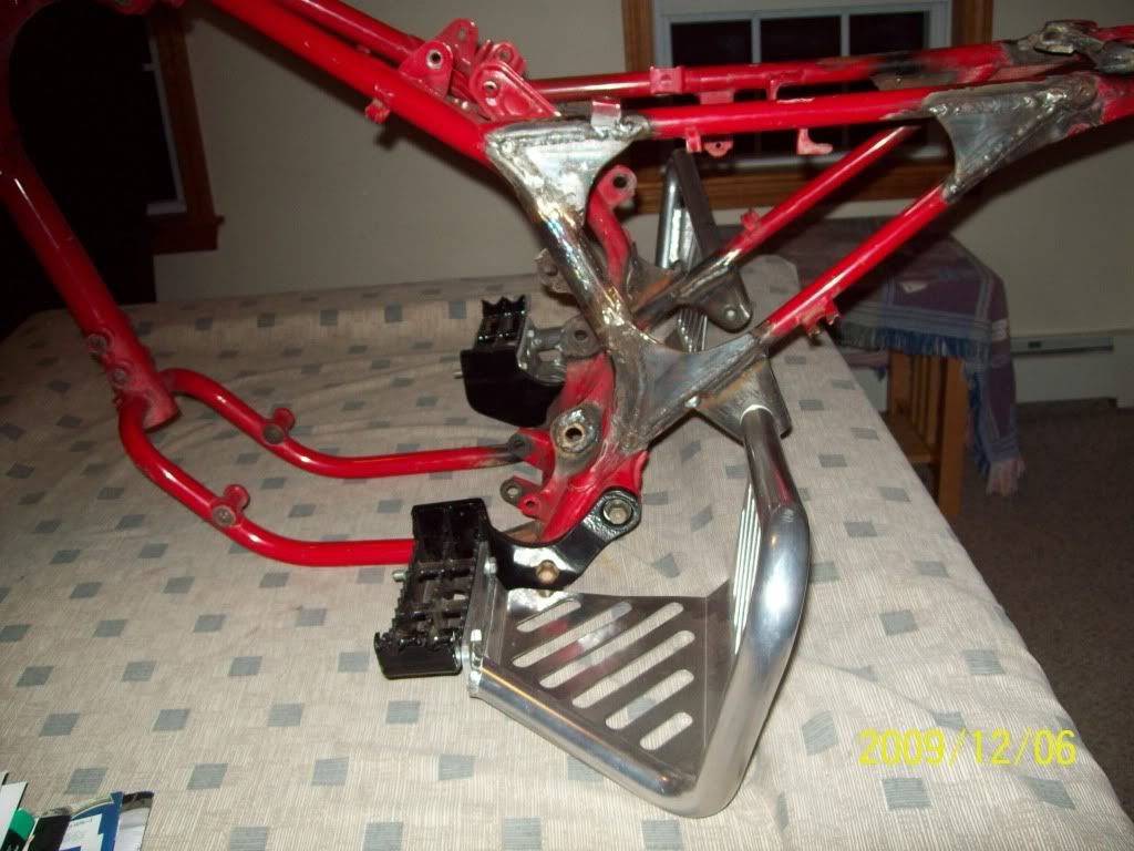 I could have adapted the stock flat chinsey brackets (they were completely different) that came with them (not sure what he ordered, maybe YZF?? or 450R??) but I cut all that crap off and made my own. That way if he ruins/bends/breaks them or takes them off there is a simple mount on the left and right frame rail that will look OEM once blasted and powder coated.