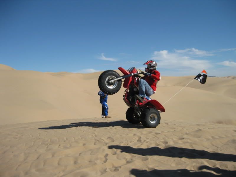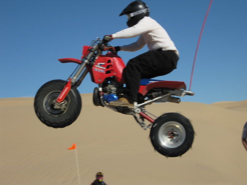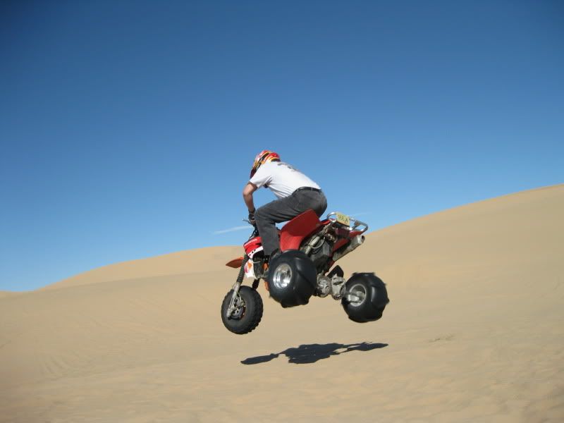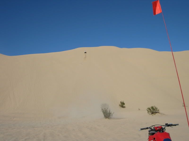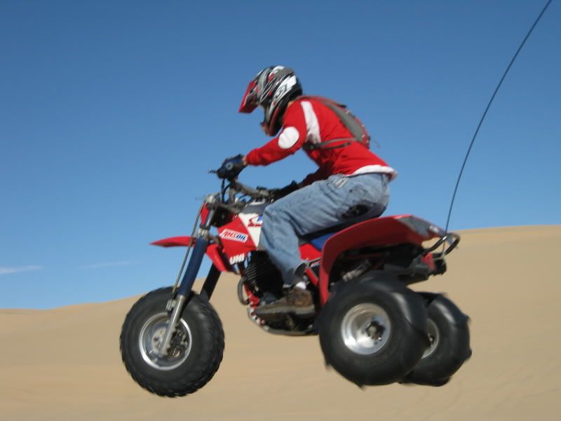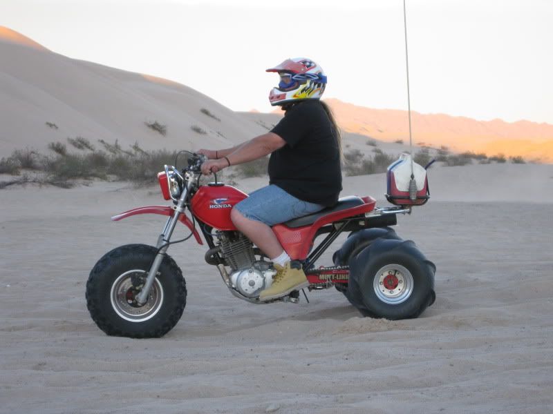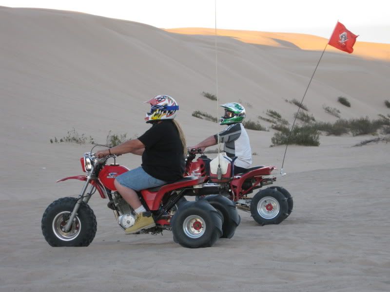 Now I'm not really sure I can honestly explain what I thought of the Dune's other than it ruined me on Silver Lake,LOL.The 1st day I was actually freaked out ,I had no clue on what to expect as to what was on the other side of the razor's and climbing some of these dune's.I was not expecting the sand too be so smooth for one,but as I was watching you west coaster's ride and following ya's from dune to dune and from bowl to dune I started too feel more comfortable but still did'nt let my guard down.There is nothing like hitting the top of a dune leaning hard to the inside of the trike, hitting the soft powder sand at the top and roosting the top and shooting straight back down~now that was a blast.Another thing that was Great was when a few of us led by Jay in his rail were out on a little ride and I found this huge ,and I'm talking Huge dune that dipped down into a huge bowl and up to another big dune with a 10 `15 foot razor that was carved in the middle that I was hitting 5th gear top'd out and catching some huge air and had the coolest landing and then I would climb back up the 2nd dune get to the top hit the soft sand lean in throw a roost come back down and do it all over again.Hard to explain really but let me tell ya that was an absolute blast,I think I hit that at least 10 time's.The hill climb's were someting to be said too,nothing like that back here in Michigan I can say that for sure.Patton's Hill was a challenge for the 350X I could'nt do it with the girl on the steep face but on the lesser slope I made it up ,but Thanks to Jason Hall for letting me run up it with his 450 which climbed it easily and Sprock let me run his 700 Raptor up it.With the 450 trike I was hillshooting that hill front tire up having the time of my life just laughing with enjoyment the whole time.I have been riding since I was just a little kid on trike's and I can tell ya all,that this trip was the best trip I have ever had in the sand and I will deffinatly be back next year,I'd suggest you guy's start saving a few buck's every week and make the trip next year. This trip was just like the 1st time I went to Trikefest and I was able to put a face on a person's name but the riding was superior compared to Haspin.I met alot more people that I can call my friend's, got to see some that I have'nt seen in year's like you,and had the absolute time of my life riding in the sand.I can say this too that like some other's on the board's I will never talk smack about riding in the dune's that's for sure, and if you all have'nt noticed I think I used the word Great more than once.The only Bummer I had with this whole trip was my luggage but that there is a story amongst itself.I still have 200+ pic's to post up that I gotta get too so look for those yet..