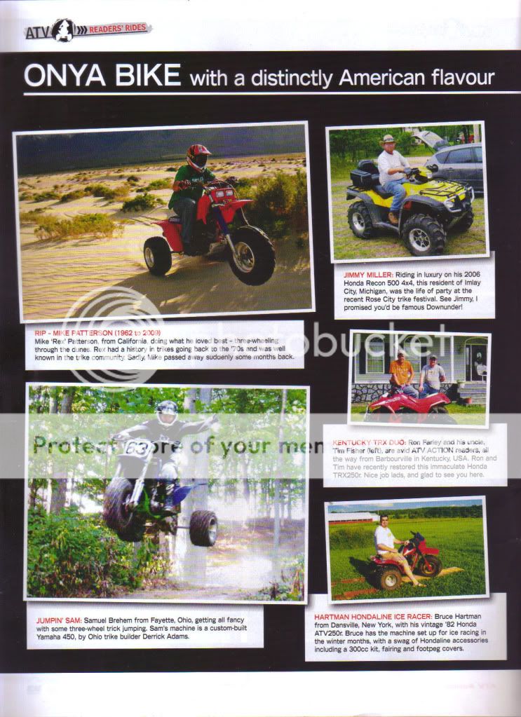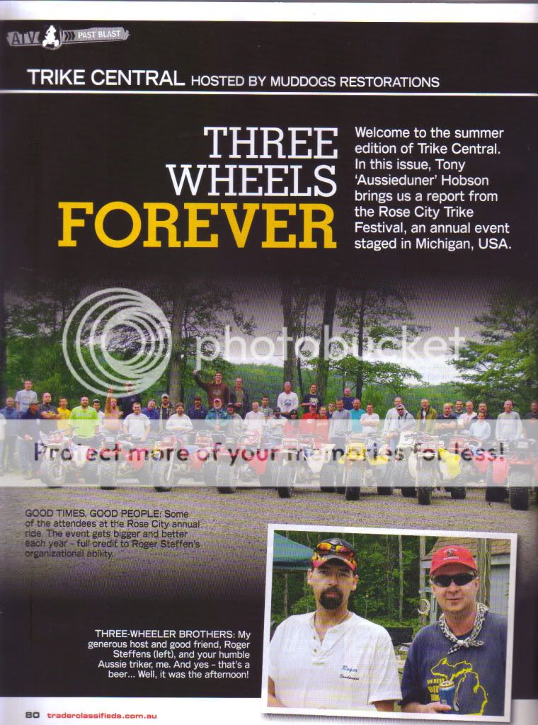 I don't readily know where you can order the magazine from but if somebody has that info i'm sure it would be appreciated.And I also heard thru the grapevine that the recent Imperial Invasion ride out in the So Cal dune's(by Glamis) is going to be in the next edition of the magazine,so that will deffinatly be a great article also.These magazine's way beat out any that we have here in the state's if you ask me,with the thickness of the page's and the glossiness of the picture's,plus they have a dedicated trike feature in every magazine issue.I showed one of the magazine's to the rep's of Dirtwheels at the dealer expo in Indy a couple week's ago and they were impressed with it.I also complained to the rep's at Dirtwheel's as to why we did'nt get a dedicated trike feature in there magazine.LOL,we'll see where that goes.