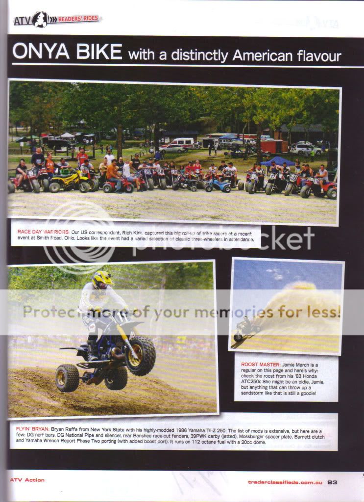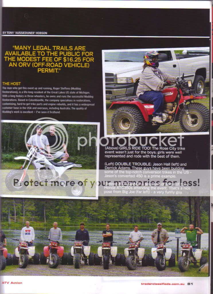 I don't know if everybody already knew this but alot of us were put into the summer edition of the Australian ATV Action magazine.I'm really happy because my annual ride that I have up in Rose City was featured in like 3 page's of the article and alot of other's were also put up in the page's also.I got ahold of Aussie the other day and he gave me permission to show the whole article now ,I know some of you have'nt seen the article yet and your picture's are in there.What else can I say other than I am happier than a pig in crap seeing my ride get this type of recognition and to see a bunch of my friend's in there also.