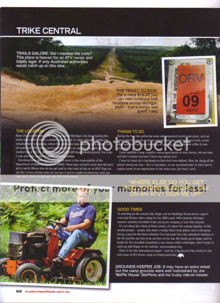 I'm totally happy that the Muddogs ride made the magazine and got the exposure and has grown to what it has over the year's and I hope it continues for many more .This ride is only an example of what happen's when we all put our mind's together and we actually do something instead of just talking about it.I myself have been to East Coast ride's and I have been to West Coast ride's and I have been to MX event's and Trikefest and have met great people at all of them and got to do some awesome riding along the way also and suggest going to any of them.There's lot's of ride's to choose from anymore.