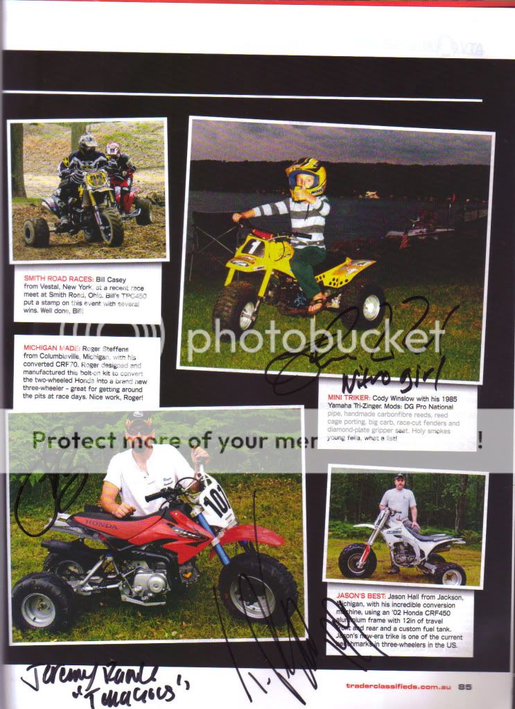 Some other stuff in the atricle is of me with my CRF/MDR 70 trike conversion,Jason Hall sporting his cool Aluminum 450 build that I can personally attest to is one awesome ride,ATC Sam jumping the Yamaha 450 conversion ,and the OTC Group photo taken at Smith Road and lot's more including Raffa getting some air.Did I mention I made it in there too,LMAO.. Enjoy!
