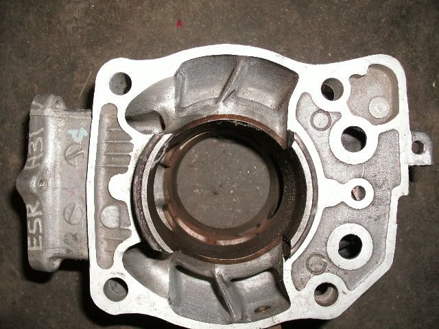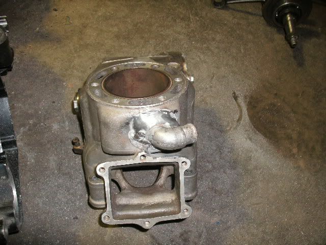This 01 cr250 cylinder is ported by ESR with a steel sleve and powervalve blockoffs. Several things i had to modify, First off the water inlet comes up under the exhaust through the bottomend on the cr. So i had those inlets welded up, and had a inlet spout welded on. These cylinders (with cr bottomend) are known to put out 65ish hp in micro sprints, and shifter karts.