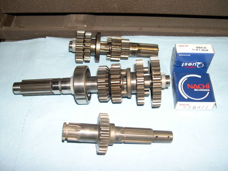 The night started good. I scored some really nice high precision Nachi 6004 and 6204 bearings at work today. I dug out the SL90 tranny shaft I bought NOS and my gear set I had cleaned up from the original 1984 110 motor I started with. I took apart the output shaft to transfer over the gearset and discovered that the original output shaft measured 20mm OD and the SL90 shaft I have measures 18mm.
