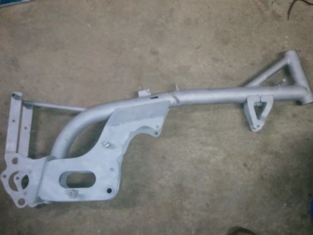Got the +3 Nicholson frame all blasted up. Has to go over to a fabricator friend of mine for some steering stop work and to have the front engine mounts straightened back out. Another goody from Mike.