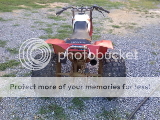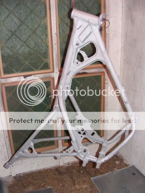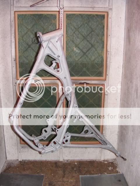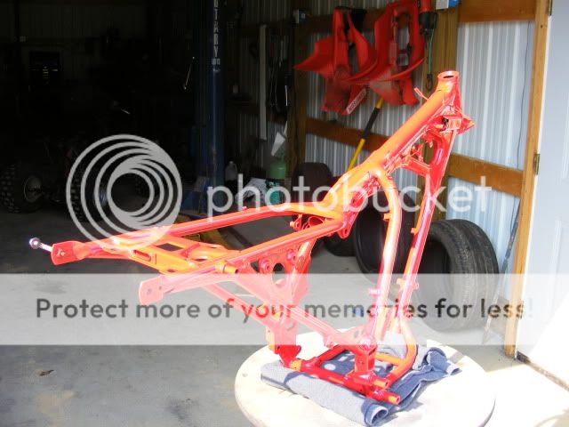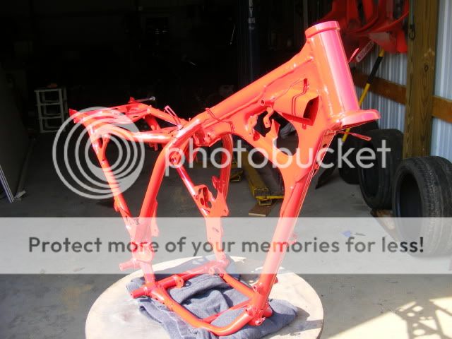 I did the frame yesterday and got to take some pictures today when I got home today. I started out wanting to restore this but the cost of restore quality used or OEM new parts would have lead to spending money that I would have to wait until I earned it to spend it. Then I thought of a color scheme that would be a show piece for my shop. Then I settled on do it and ride it ASAP. I have plenty extra mirror red on hand and it is a Honda, so close enough. If you haven't guess, I plan on this being a rider. So, I didn't go through the pains of working the metal. filling the rough places left by surface rust or filing off the welding splatter. It could have been done slicker but the rust is gone and the PC is trail worthy.