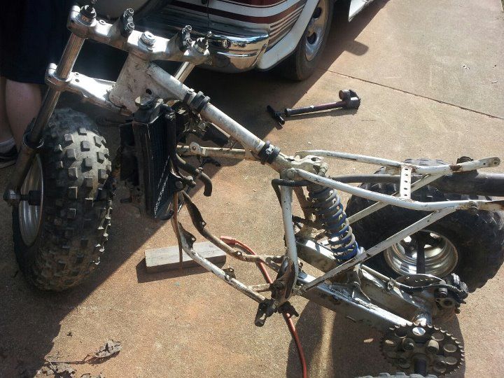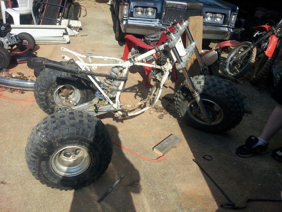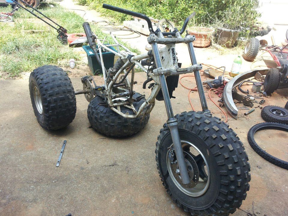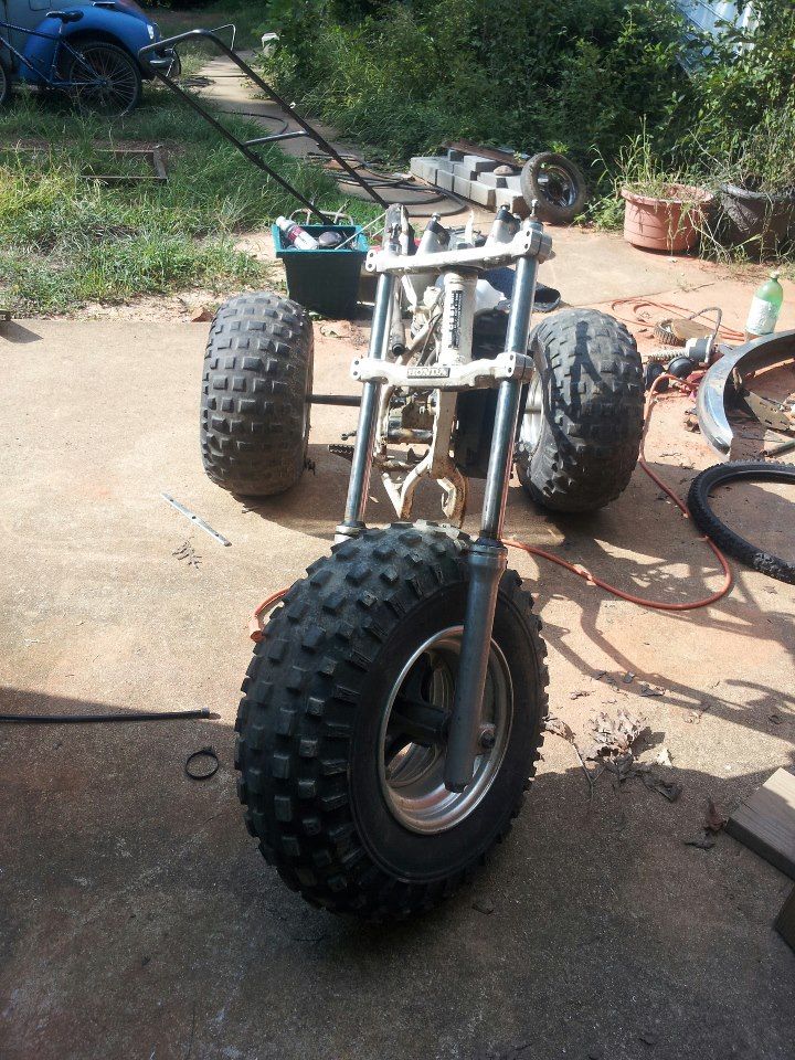 Alright guys. I've been wanting to build a custom trike and you guys might have seen my other feeler threads. but this is for real, and its happening. I waited until I got some progress done and knew it would all work (for the most part) to get this thread up. Its a 1990 Honda CR 80R 2 stroke dirt bike, with a 1st gen 200x front end including triples, and a 1st gen 200x swingarm, axle, hubs, ect. I bet your wondering, what did I have to do to get this all to fit? Well, it was very simple