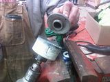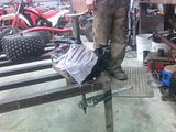Well, I am currently building another big bore 70 for a friend. He also wanted the trurned down hubs to adapt to cart pattern wheels that most of us use. So...without wanting to pay a machine shop, and not having a lathe..we came up with this.With the axle still mounted into frame, we braced it up on a stand I have. Installed the stock hub on the spline and rigged a pipe wrench up to back up the axle to prevent turning while he drilled. The key here was to use a thru type arbor for the holesaw that the pilot bit will adjust to any depth and to leave the pilot bit a bit loose so it will move as you drill . We ground the pilot flat as to not screw up the axle end also. Next using a standard metal holesaw size 3 1/4" and a good strong electric drill..we began. I was the oiler while he gradually started to drill. You only want to leave the pilot bit in till you get some good cutting marks started then remove. It worked great and took some patience when cutting..slow and lots of fluid. A little dremel work and bench grinding and presto!!