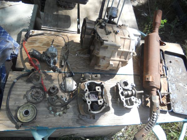 So far, I've sanded down the frame, forks and rear plastic (still missing the front plastic) and painted everything. I've had great luck with Krylon Fusion, so I chose Red Pepper and did the forks and rear plastic with it; I am very happy with the results. This weekend I stripped the engine down to pieces, degreased everything in my parts washer and then threw the case parts in the dishwasher. A nice coat of Duplicolor Cast Aluminum made everything look great.