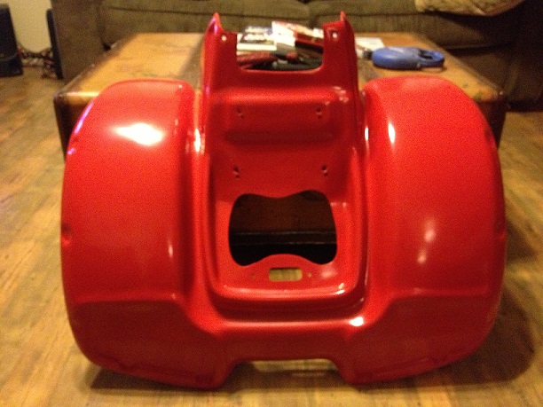 So far, I've sanded down the frame, forks and rear plastic (still missing the front plastic) and painted everything. I've had great luck with Krylon Fusion, so I chose Red Pepper and did the forks and rear plastic with it; I am very happy with the results. This weekend I stripped the engine down to pieces, degreased everything in my parts washer and then threw the case parts in the dishwasher. A nice coat of Duplicolor Cast Aluminum made everything look great.