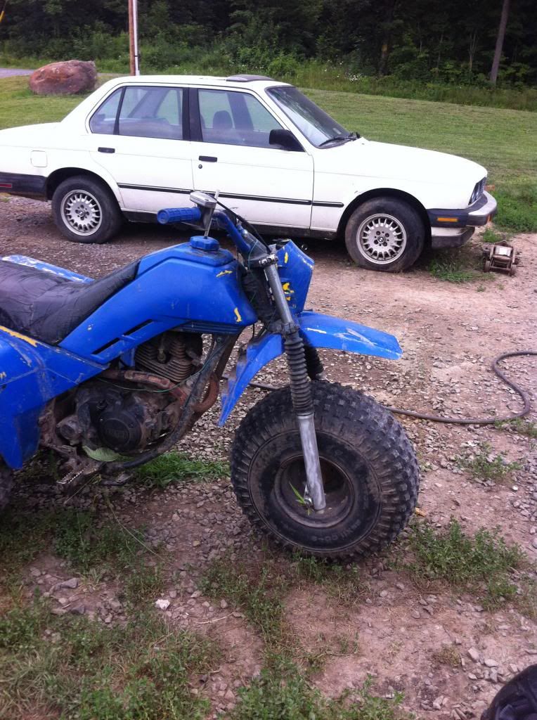 I was just riding my dx thru a big field of grass about 4 feet deep, I was goin about 10mph and guess what happened? I hit a big rock(( it bent both of my front forks completely, and it bent it my brake casing thing, so its grinding on the rotor. So now I gotta get it prepared for surgery. I have a pair of forks from my 79 Honda twinstar and it looks like it might just bolt up, but if not ill just have to buy a pair, and then I gotta bend the brake casing back out. So that's what I'm gonna be doing soon. And right now is the worst time for me to do it, since I'm working ALOT I don't have much spare time. So I'm probably gonna get started right after I'm done typing this