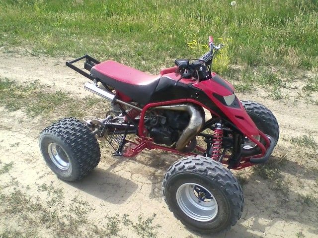 Blaster 206. Wiesco piston/rod/crank, graydon proline rh bend pipe, airstriker carb, 6+twin beam tubular swing arm(one off), suzuki lt250s carrier/axle/hubs/rear disc, lt250s alum front hubs/rolled rims, douglas black dots rear, fender delete, bars/grips/heelcages/grabbar, showa shox.