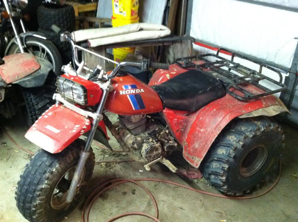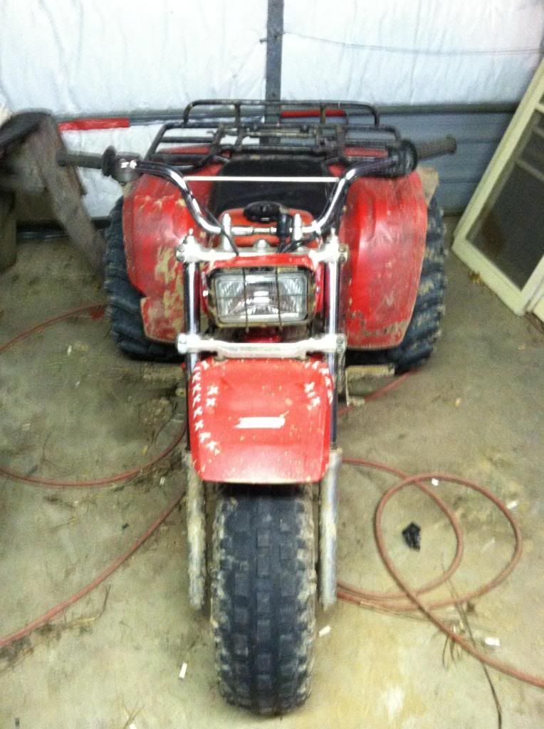 A headlight at last!!! And a fender flap at the bottom from an atc110. Now just for the bulb lock ring and it will be complete. I'll get the factory 200x bars soon.
