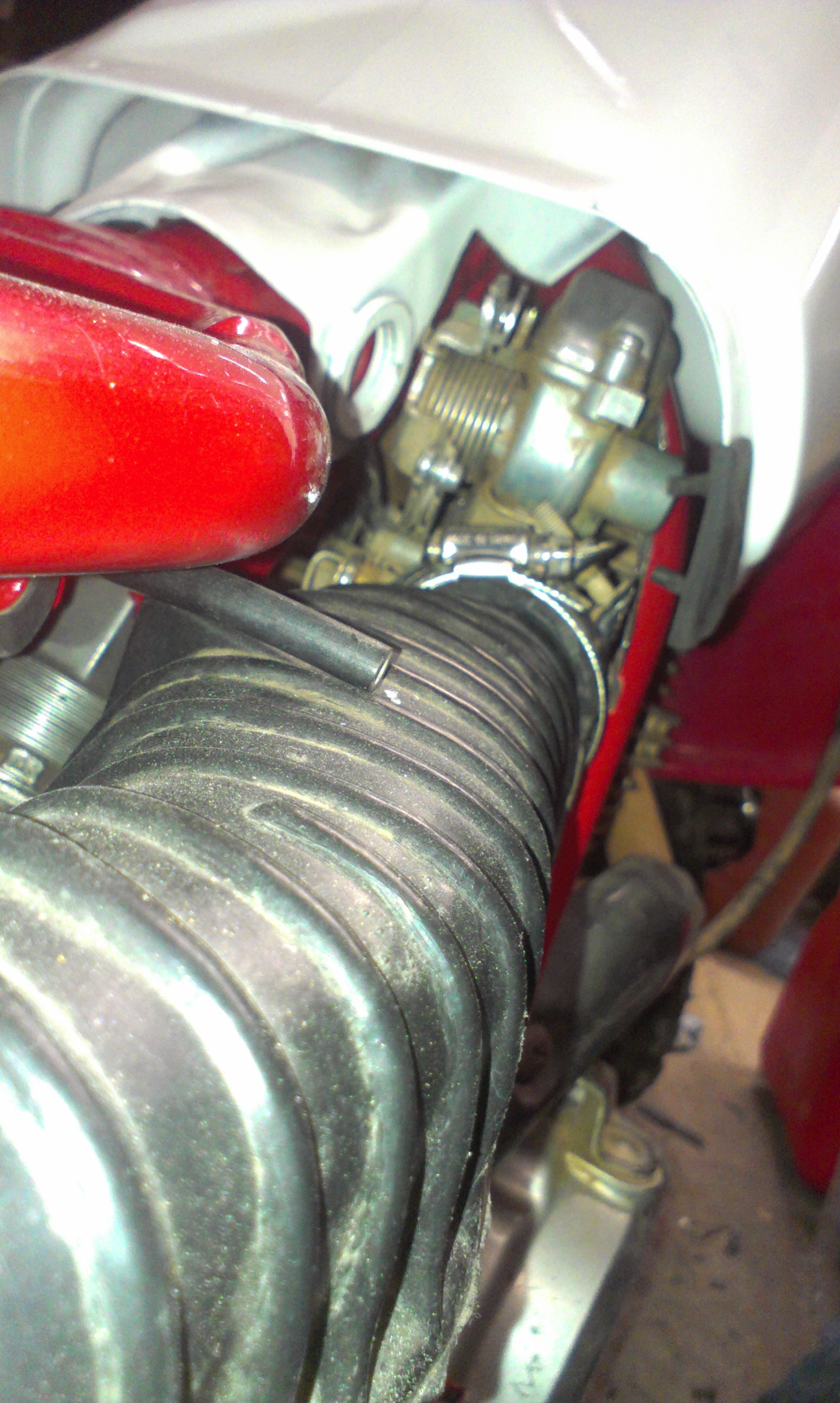 So fare I have the engine and carb in the frame and the carb is attached to the stock air box. I had to trim the frame to fit the carb in the frame. The motor bolted right in except for the head motor mounts. BUT The chain was way to close to the side of the frame, hardly 1\16, so I moved the whole engine to the right by 3/16, which was as much as I really could, now I have about 1/4 which is still close but alot better.