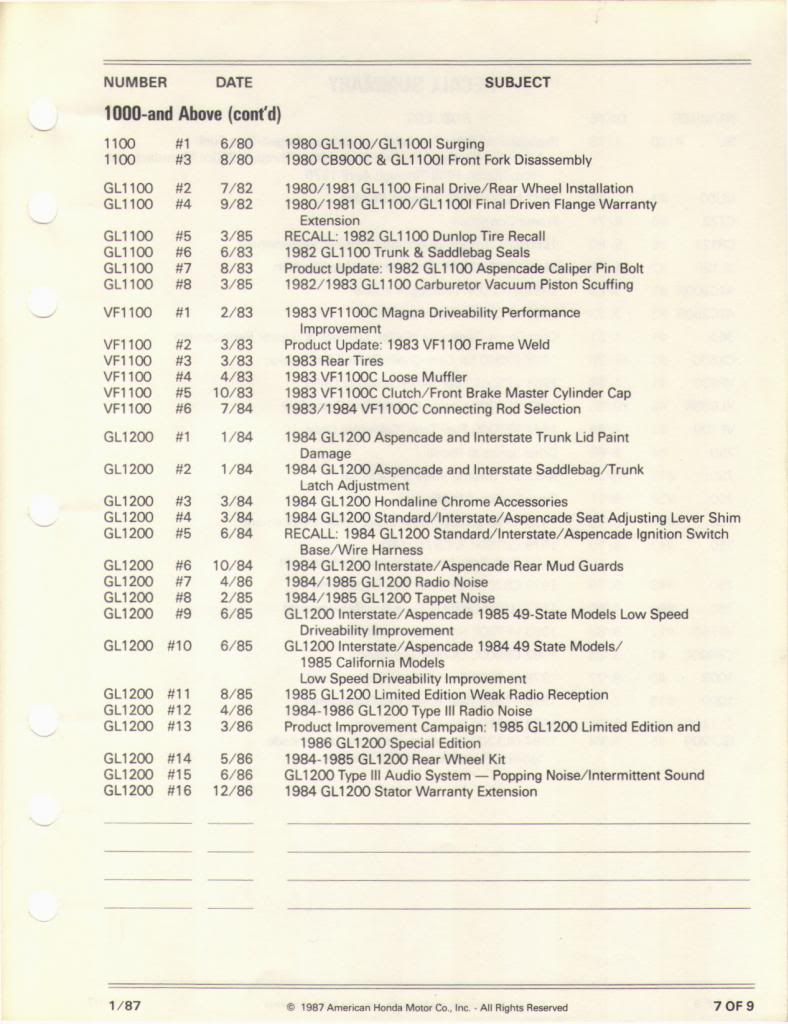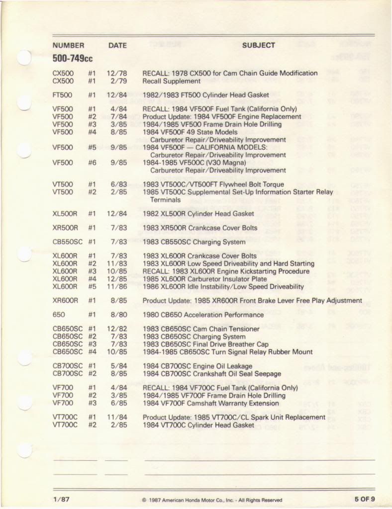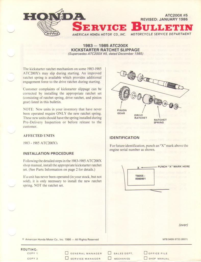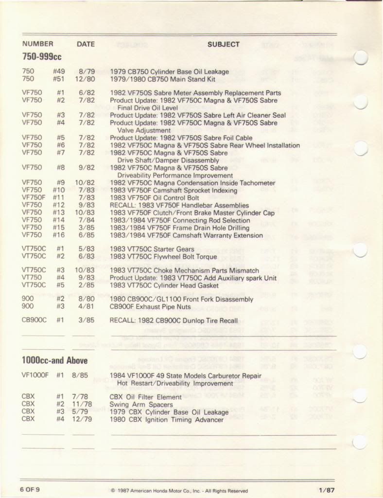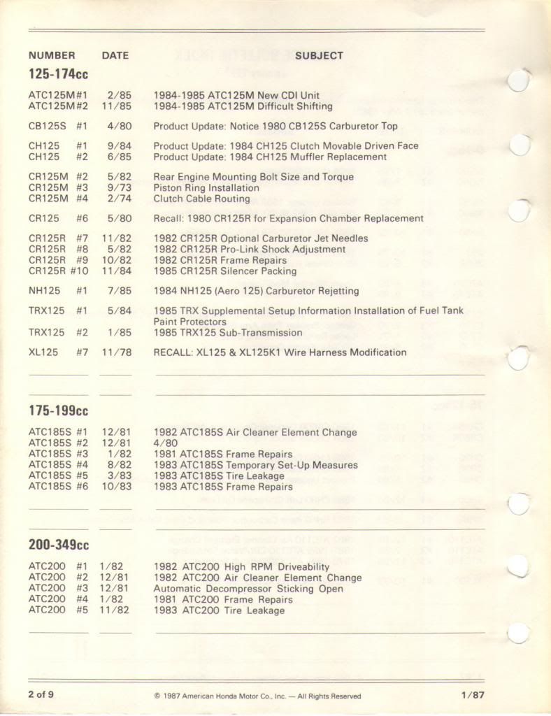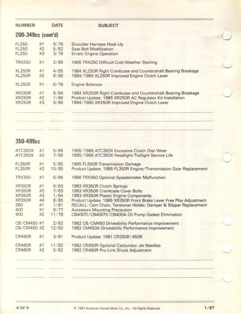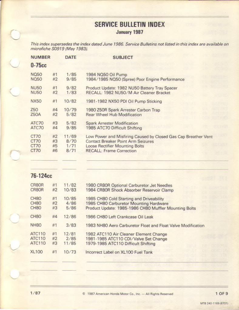 I scored a collection of Honda Service Bulletins on e-bay. The binder appears pretty complete, and includes service bulletins through January of 1987.