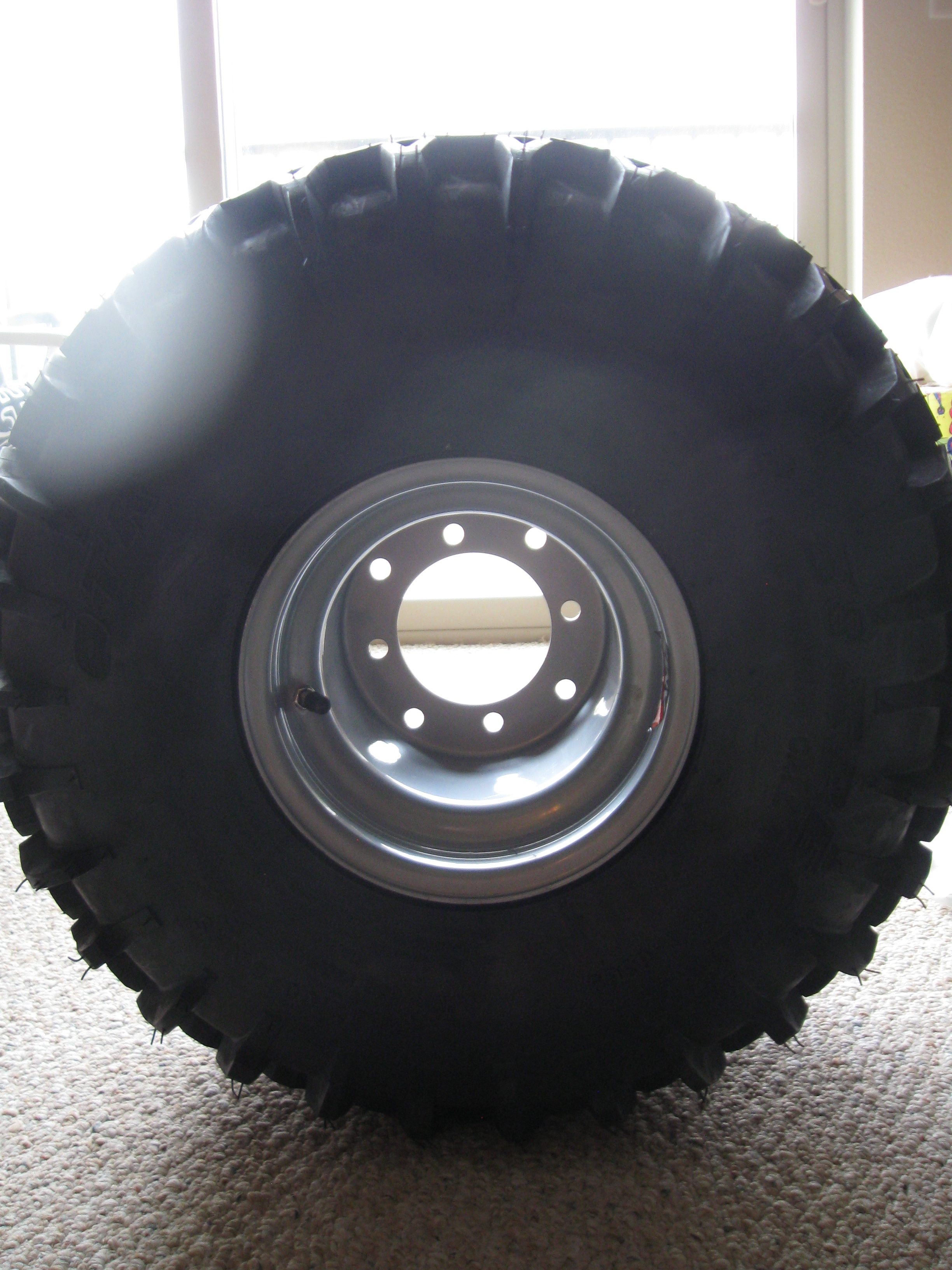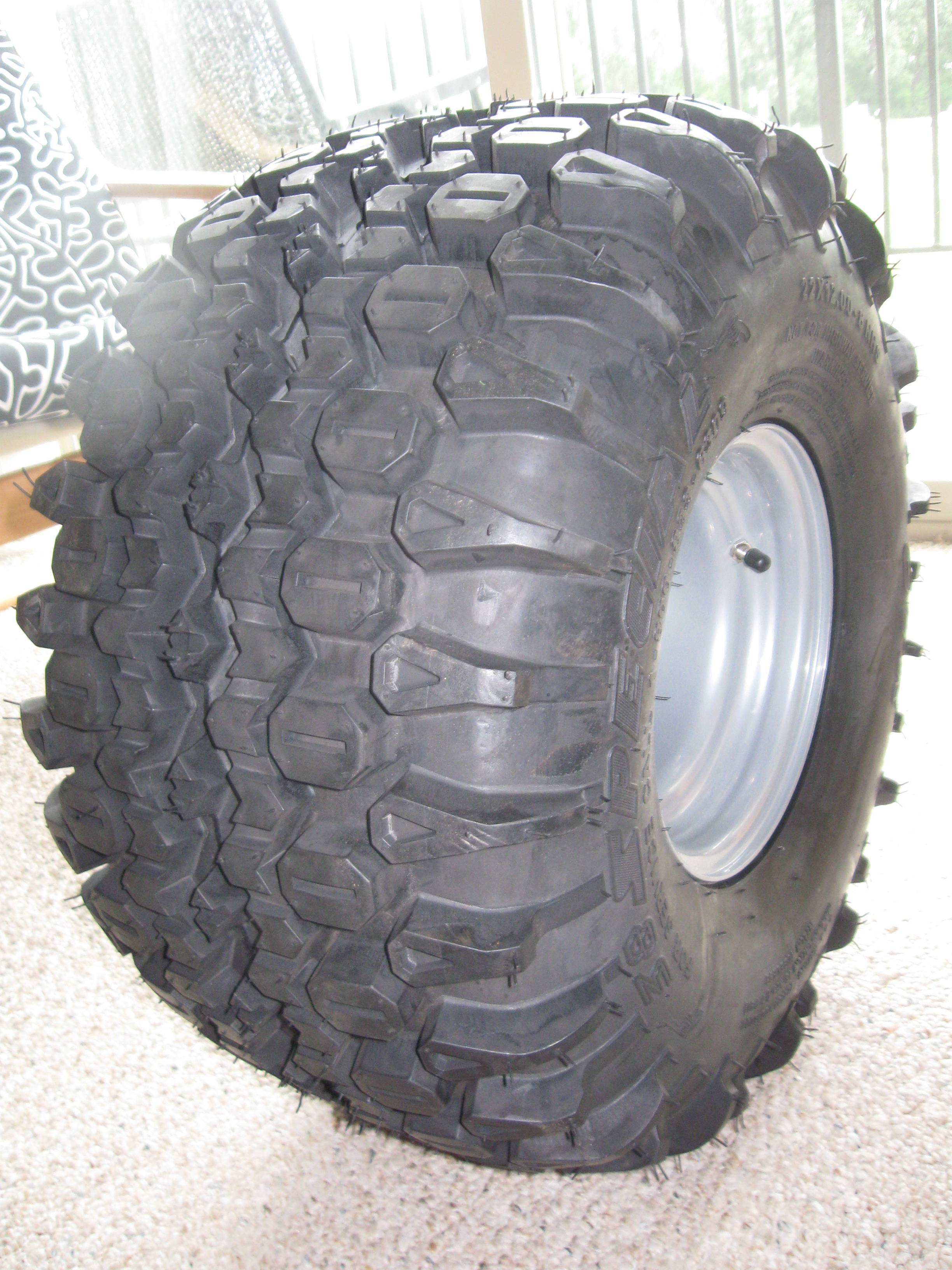 I bought these gnarly tires to upgrade the rear tires on my 110 honda. These are called the OTR 38 Special. They look pretty gnarly to me and I think they will provide adequate traction for my needs without bogging down the 110cc engine. They are super thick tires and have a flat profile which means a larger contact patch with the ground. I think they are 6 ply tires. I had these mounted on AMS steel wheels with tubes. $300 for the pair but I think well worth the money. I will post an update soon on their performance. Click image for larger version.