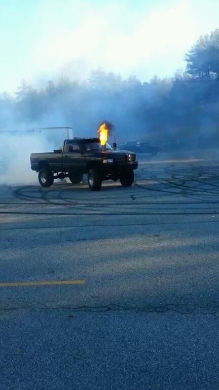 This is Billy "Hoodstack" from the next town over. Nice kid. I took this pic on Thanksgiving of last year at the annual "Turkey Day Burnouts". It takes place really early in the morning. Now to each their own, you all have your own personal preferences, but having double the power of a tractor trailer in a pickup that belches flames in the air and absolutely sa-molders the tires sounds like a really good time to me. There were sports cars and trucks of every make and model you could possibly think of that day, but he took the show. Now I completely understand if that kind of thing isn't up your alley, I think there may be a flea market nearby or something, but I'll ride my way on to the next place with a smile on my face and flames shooting in the air hauling heavy thank you very much sir.