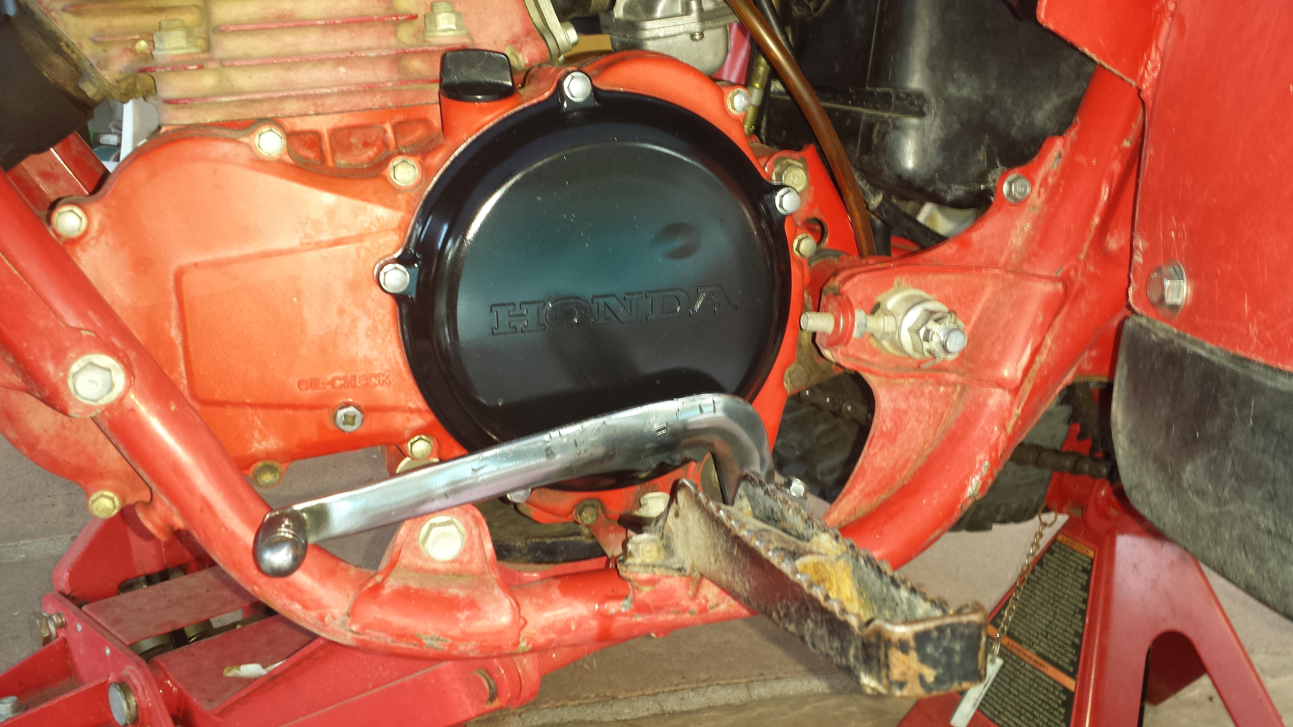 Removed the Clutch Cover and Forks. Man, those are a bear to remove the axle shaft. Pretty sure it's never been removed since it was built in 1982. Removed the red Paint and was going to paint them black, but the aluminum under the paint was so nice, I decided to just polish them up and clear coat them. Did a quick polish on one of the forks, will make them better but ran out of daylight.