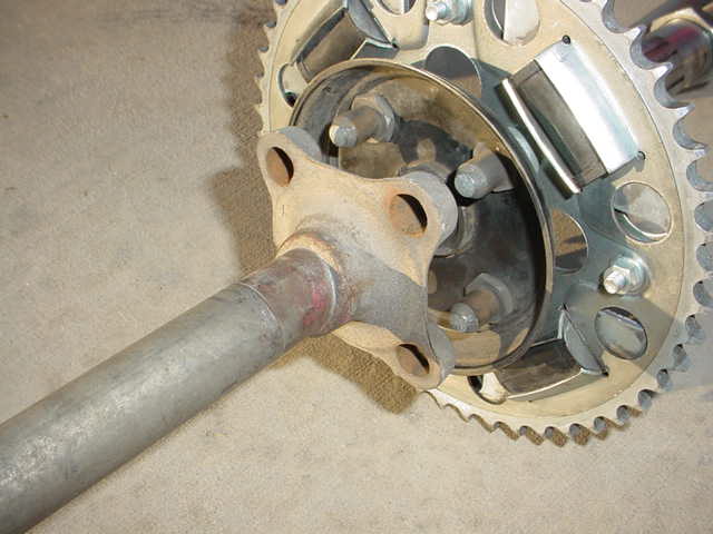 OK yes the picture “ps2fixer” shows the axle removed with the “wheel shaft” (what the manual calls it) assembly still installed. For normal disassembly to transport you remove the right side axle nut, wheel/hub, and distance collar (sleeve). DO NOT remove the lock nut next to the brake drum. Now slide left side wheel/axle assembly out of “wheel shaft” off the four drive pins. May be stuck or rusted in place, lightly tap with . Chain guard, sprocket, and brake drum assemblies remain in place.