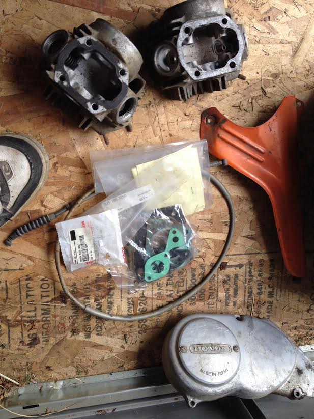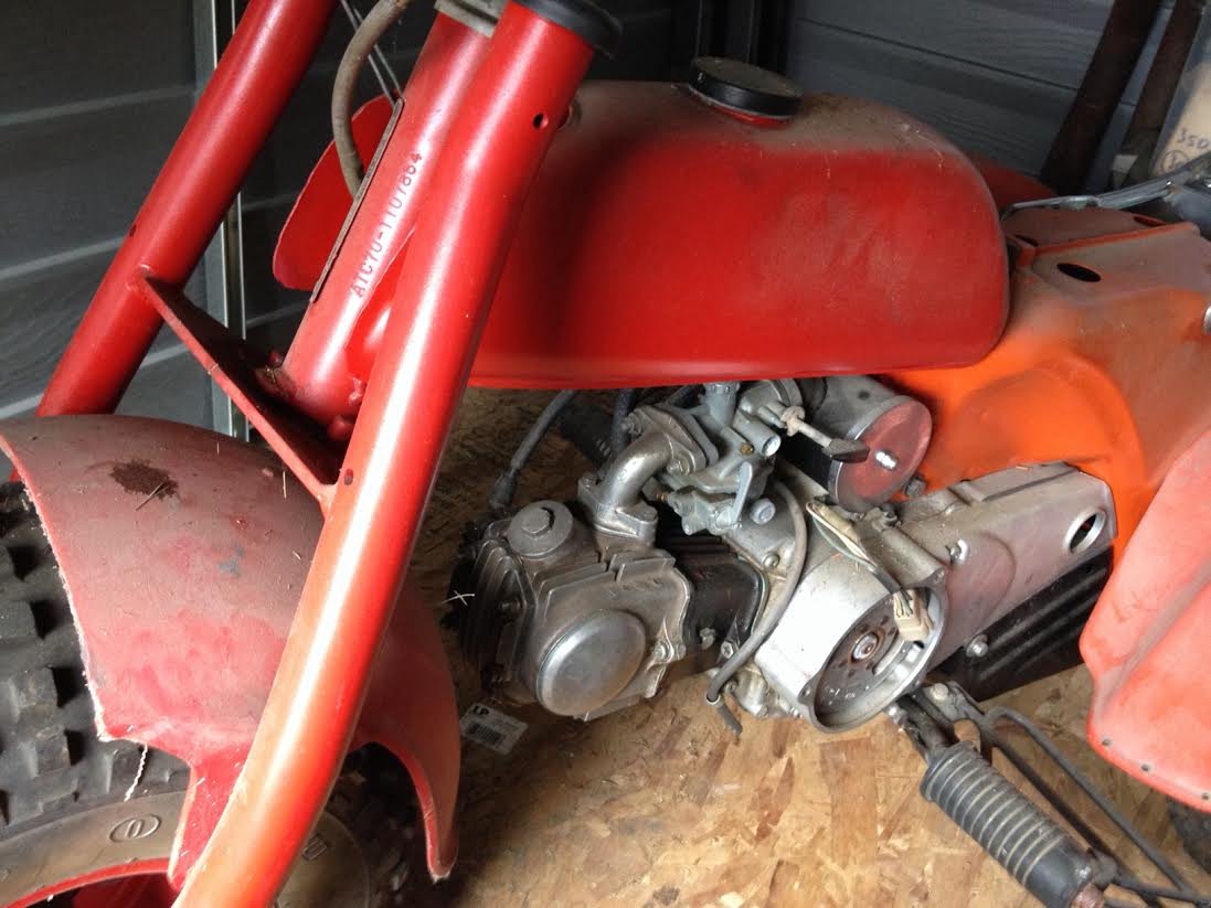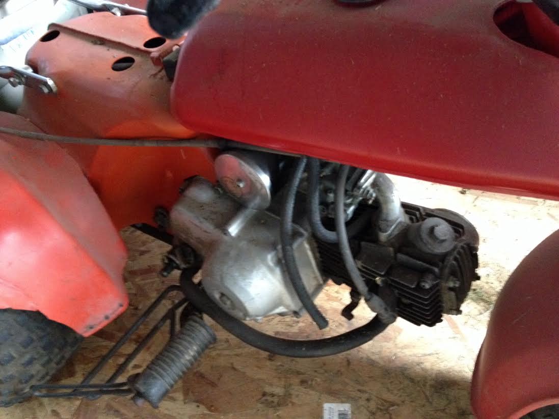 Good catch on the kickstarter jb. Probably a Trail 70 motor. I'm going to have to build another shop if he keeps bringing trikes home. Looks like only the exhaust shield is missing.