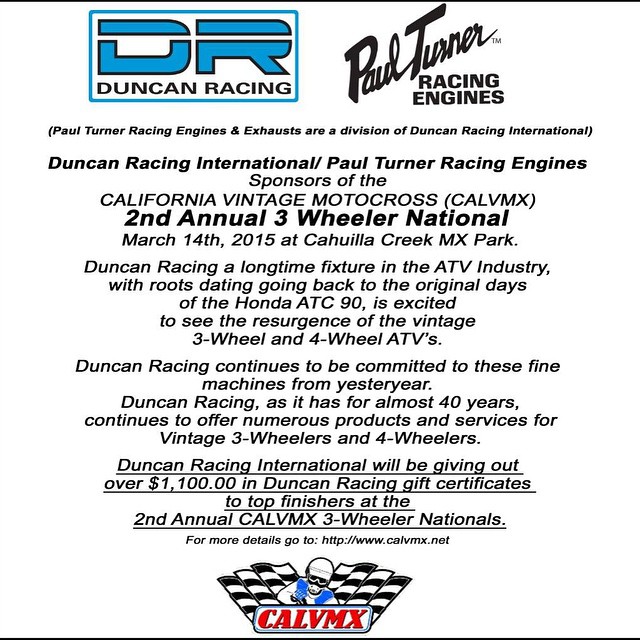ok, here's a link to the CALVMX 3 Wheeler Nationals if your attending, even as a spectator, let em know https://www.facebook.com/events/1406547029652277