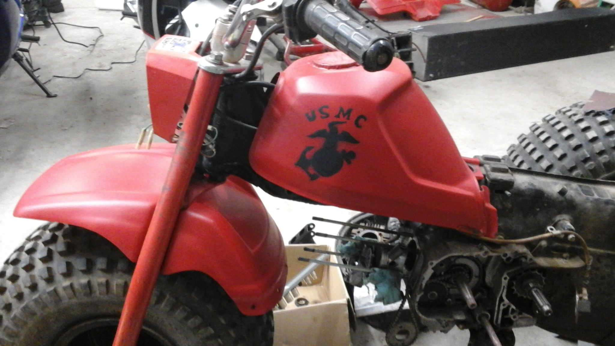 Hey guys. I recently got a three wheeler for free from someone I know because they had the top end torn apart cause it didn't work. I sent the head away so they could put valves in it because one went bad, because it hit the spark plug. I got them out but didn't have a valve spring compressor so I couldn't put them back in. These pics are from when I first got it. I have more pics I will put on tonight or tomorrow. I do have a rear fender that has a crack but I forgot to take a picture of it. Ill keep you guys up to date the best I can when I make progress.![]()