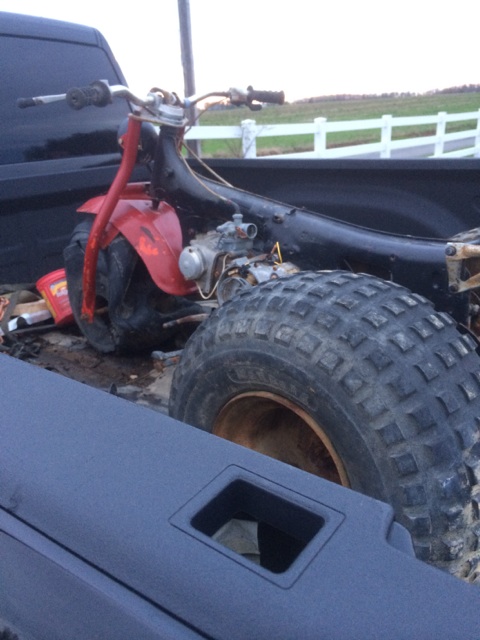 My dad found a 110 he liked on the internet 4 years ago around St. Louis, so to make us feel better about making a 3 hour haul for a threewheeler we bought tickets to go to the supercross that was coming up. We drove over the next day to look at the threewheeler and wound up leaving with the 110 and an 84 200x. Once we got back the threewheeler got pushed aside, until I brought home a 70. So today we had to go get the 110 out of storage. Its got quite a few aftermarket parts on it and an aftermarket frame. I was wondering if anyone could help us figure out what brand frame this is:The last one is just how we drove the 230 miles home lol