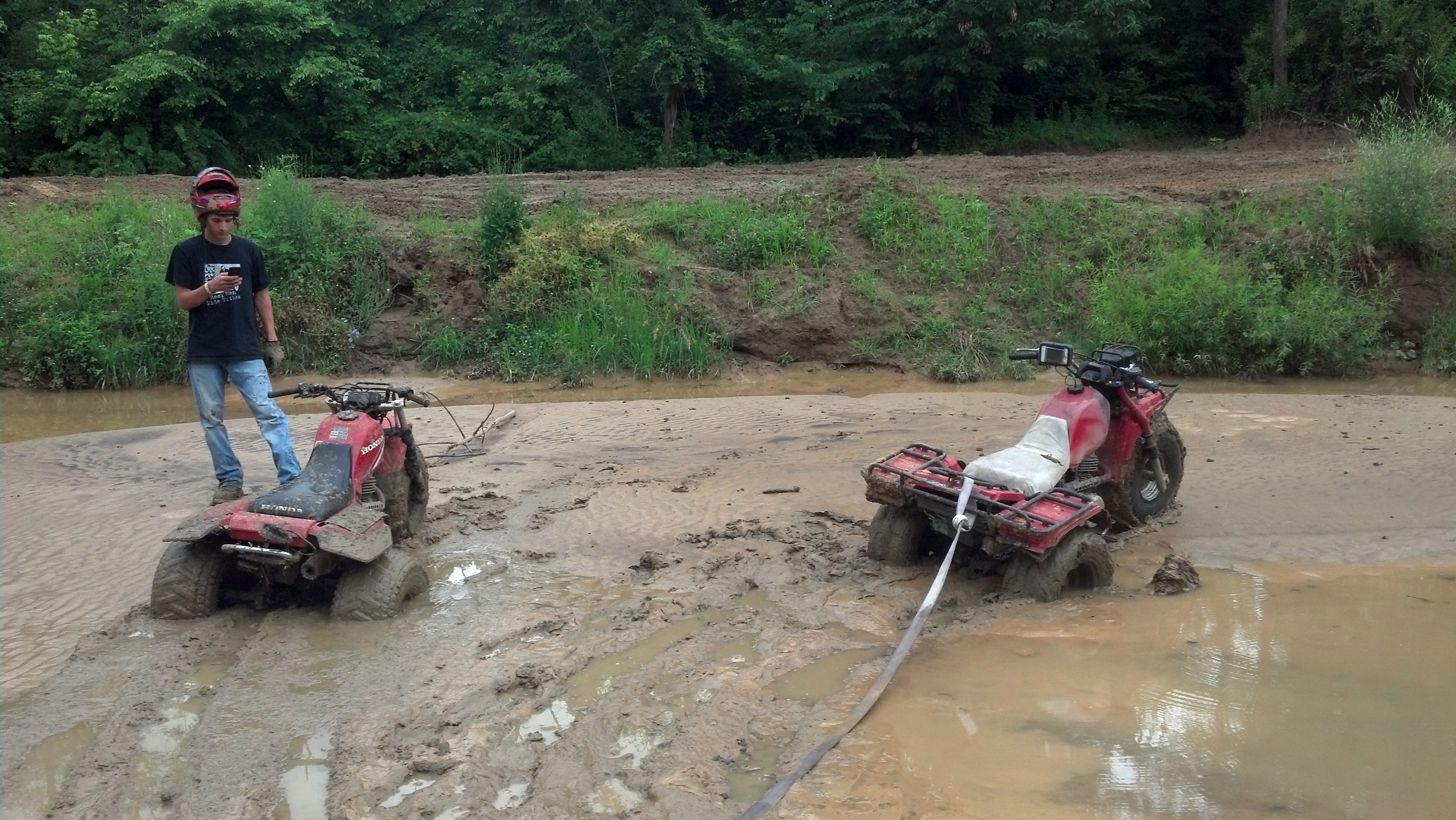 Out in the trails there is a pond type of thing that the clay gathered when it rained, well my cousin figured it looked solid and started to drive across in his 250sx, so me with better tires figured I'll go next to him so I can pull him out when he got stuck... well he started to spin and sunk quick, and I made it about 3 feet in front of him and sunk just as bad! An english fellow came along and stopped to watch and once we got the machines out he just had to ask us...