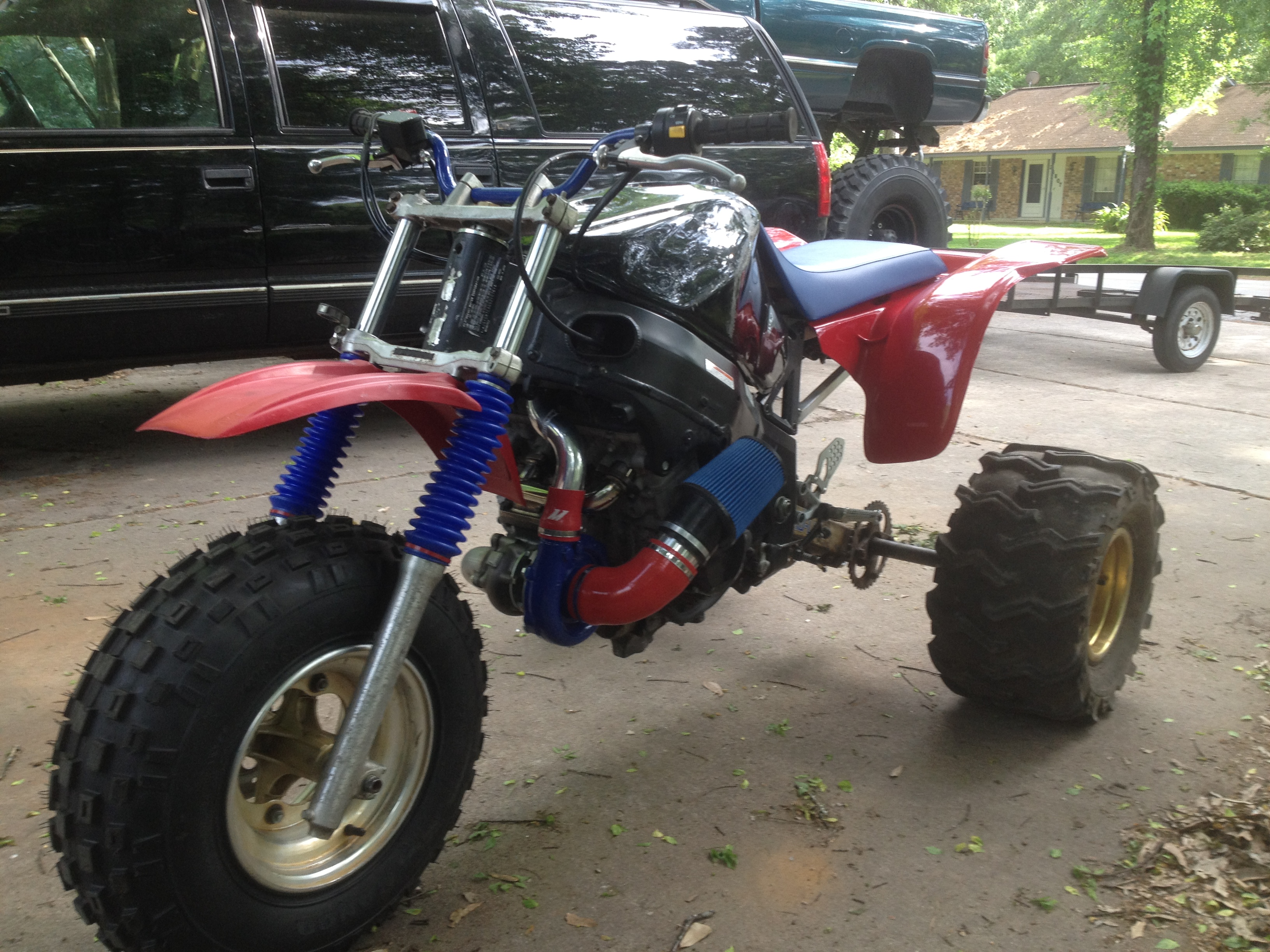 Hey everyone, just found this site and wanted to share some pics of my latest build. I have built and raced 3 wheelers for years and its nice to finally find a place where we can all get together. This is a 05 GSXR 750 motor and frame with 86 ATC250R suspension. Its not complete yet but just getting the wiring done and finishing up the turbo kit. All the work was done by me, let me know what you think