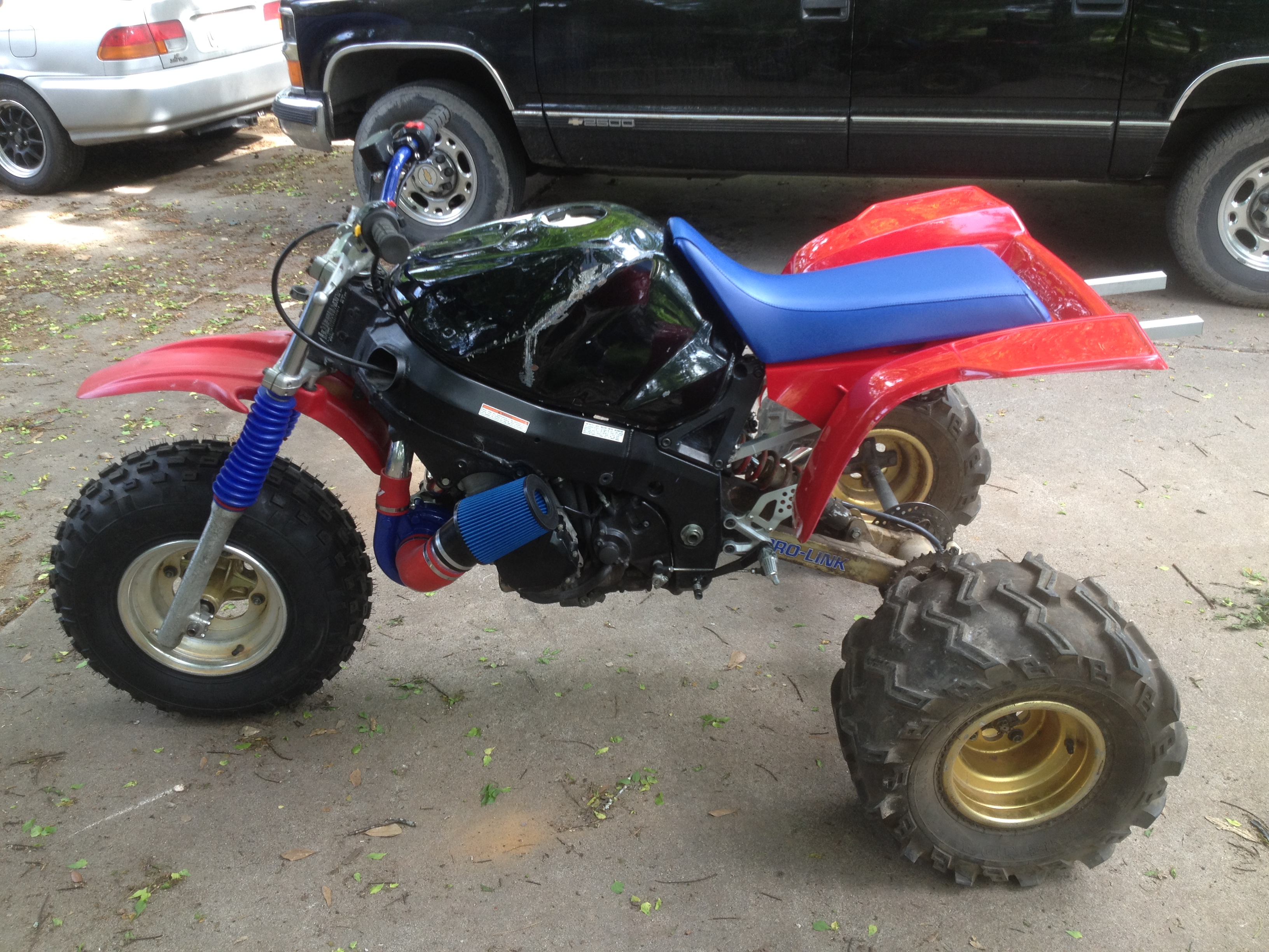 Hey everyone, just found this site and wanted to share some pics of my latest build. I have built and raced 3 wheelers for years and its nice to finally find a place where we can all get together. This is a 05 GSXR 750 motor and frame with 86 ATC250R suspension. Its not complete yet but just getting the wiring done and finishing up the turbo kit. All the work was done by me, let me know what you think