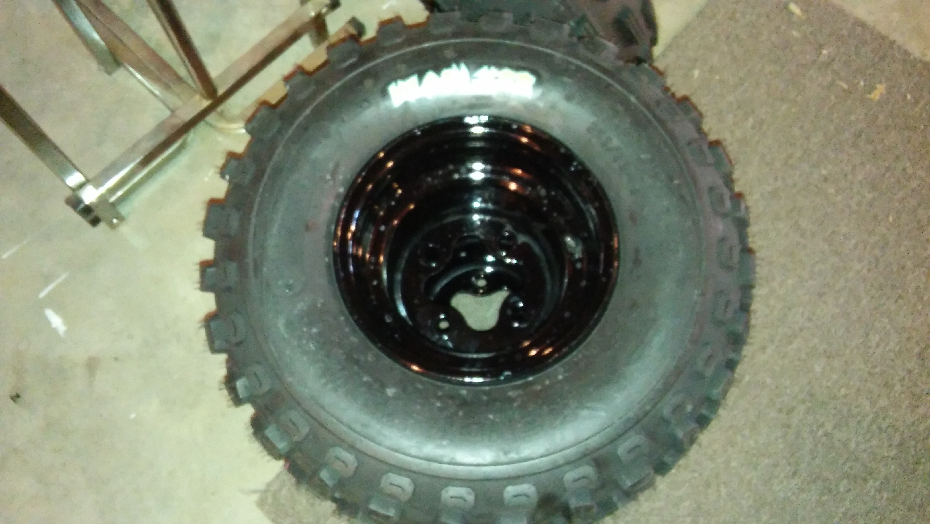 Anyway, here's the stock rims powder coated gloss black. The tires are Kenda Klaw 20x11-9 in the back and Kenda Front Max 23x8-11 in the front. In tried the Klaw in the past and really liked how easy it was to drift the rear end of the quad so it should be ideal for a trike