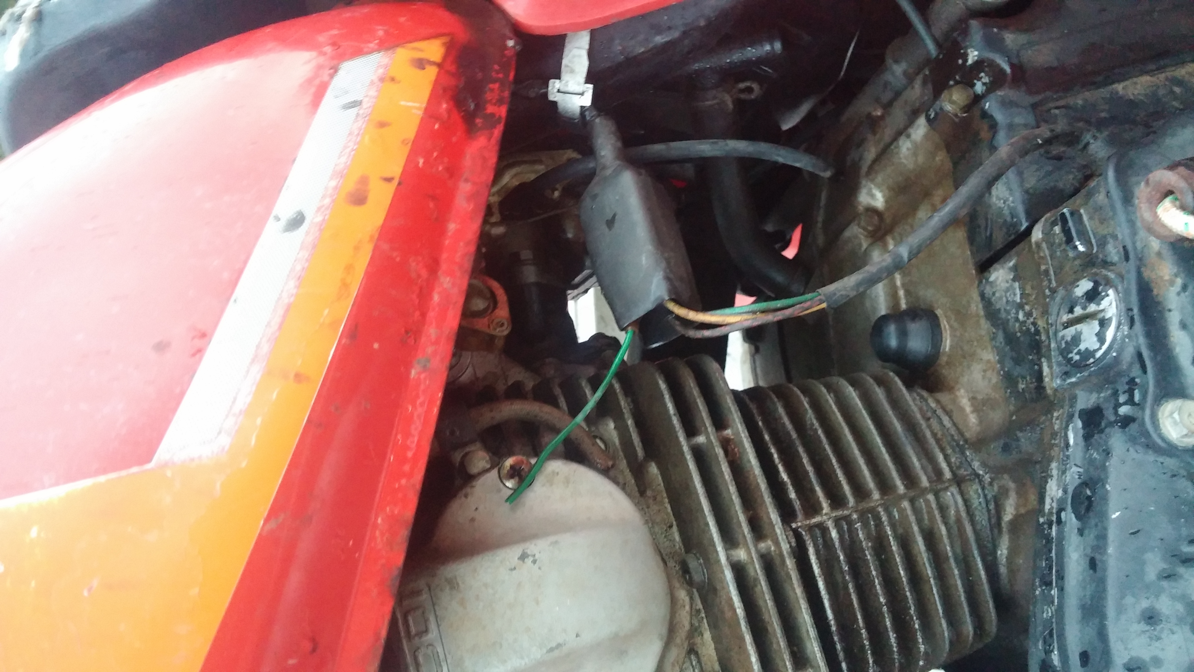 I picked this ride up for $125 yesterday. The guy said the chain came off with him one day and he parked it and hadn't fooled with it since. Said it has been sitting six or seven years. The tank has some pinholes rusted in it in the lower section nearest seat. I have not torn into it yet but it needs a few small things like a brake lever, probably a new chain, some paint in a few places to freshen up things and obviously I'll put new brake shoes on it. All in all it looks to be in my opinion in pretty good shape. No doubt it was worth the money I spent and the best part is when I shot a little gas into the cylinder it fired right up. I will be needing some help on this as I go along starting with some wiring. If you look in the second picture there is a green wire that's obviously a ground wire and he said it wouldn't crank unless that was plugged in and that the neutral light stays on all the time. So any suggestions as to what I need to do to correct this? Are there any wiring diagrams on this site? Thanks in advance to any and all help