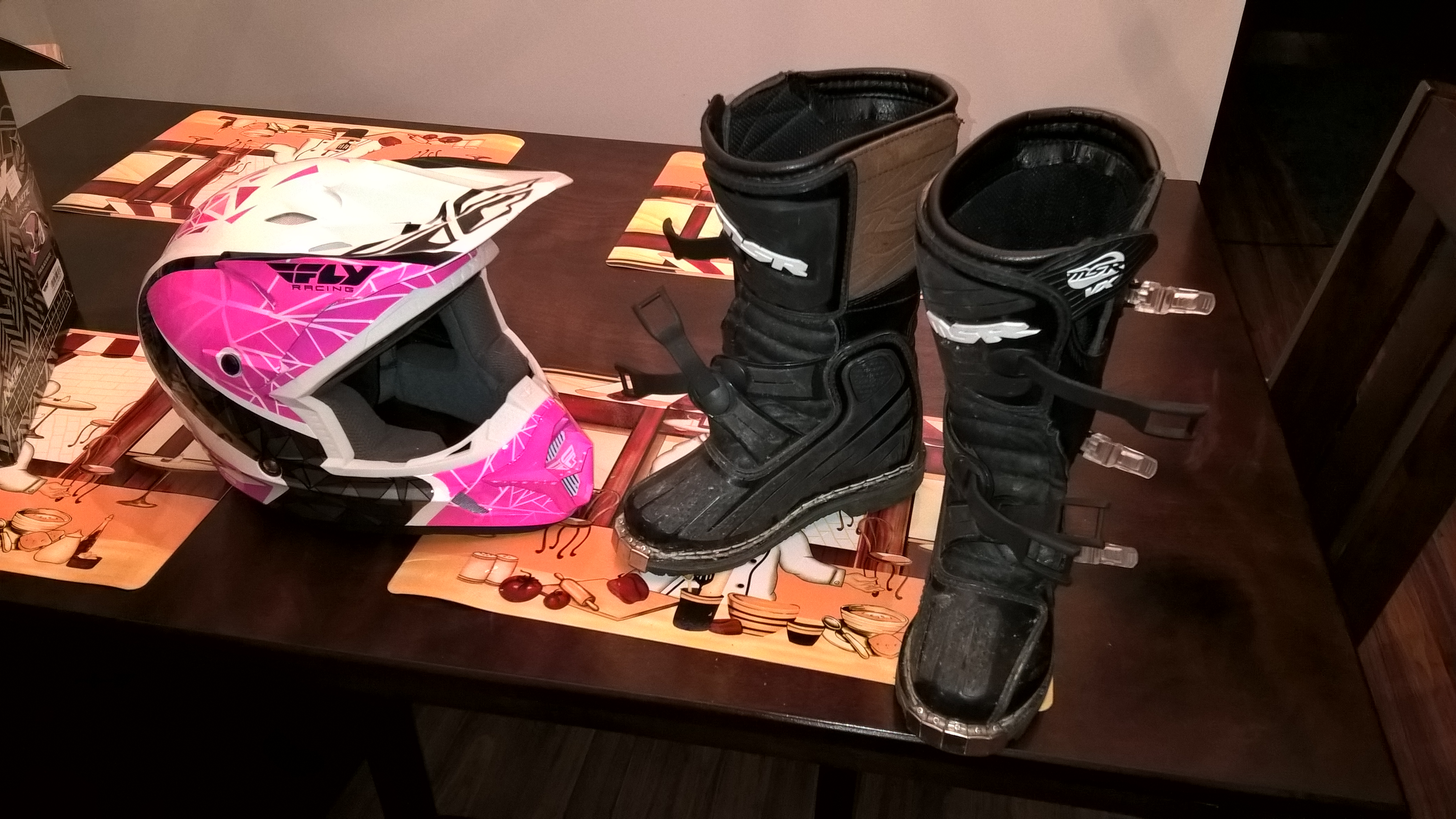 I will have a girls youth large FLY racing kinetic helmet ( new in box, never worn ) and a pair of MSR size 3 MX boots in very good condition. $100 for both...