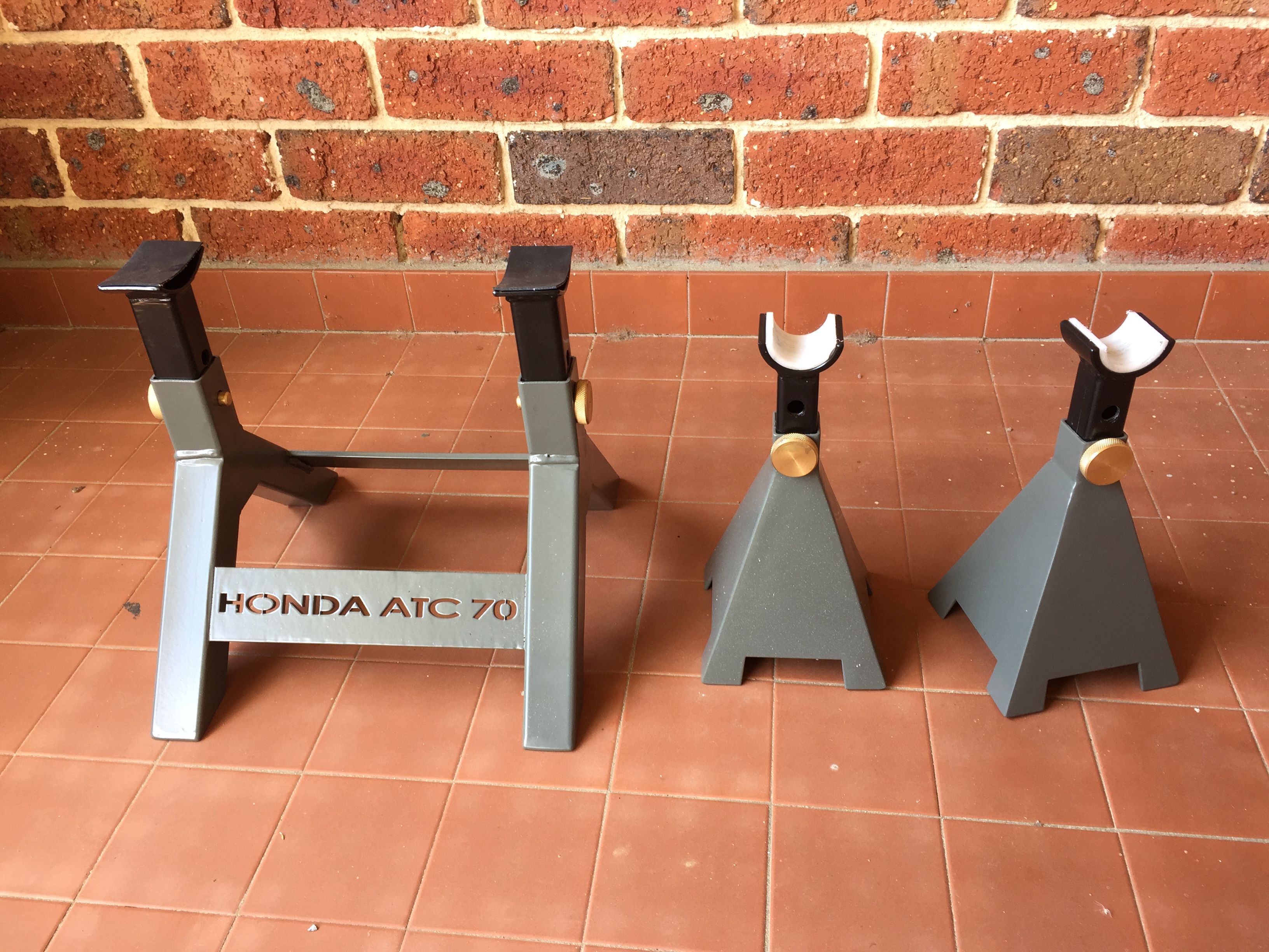 So I had to make a metal project for my capstone unit at UNI, so I decided to build some custom atc 70 stands. The rears are laser cut plates welded together with an outer and inner sleeve. The cups were machined on a lathe to match the axle crush tube diameter then cut in half. The inner material for the rear axle stand is a plastic with low friction (UHWPE from memory) so that you can rotate the axle/wheels easily whilst on the stand. I machined some brass pins with a knurl for some aesthetics. For finishing they got powder coated. Here's some pics.