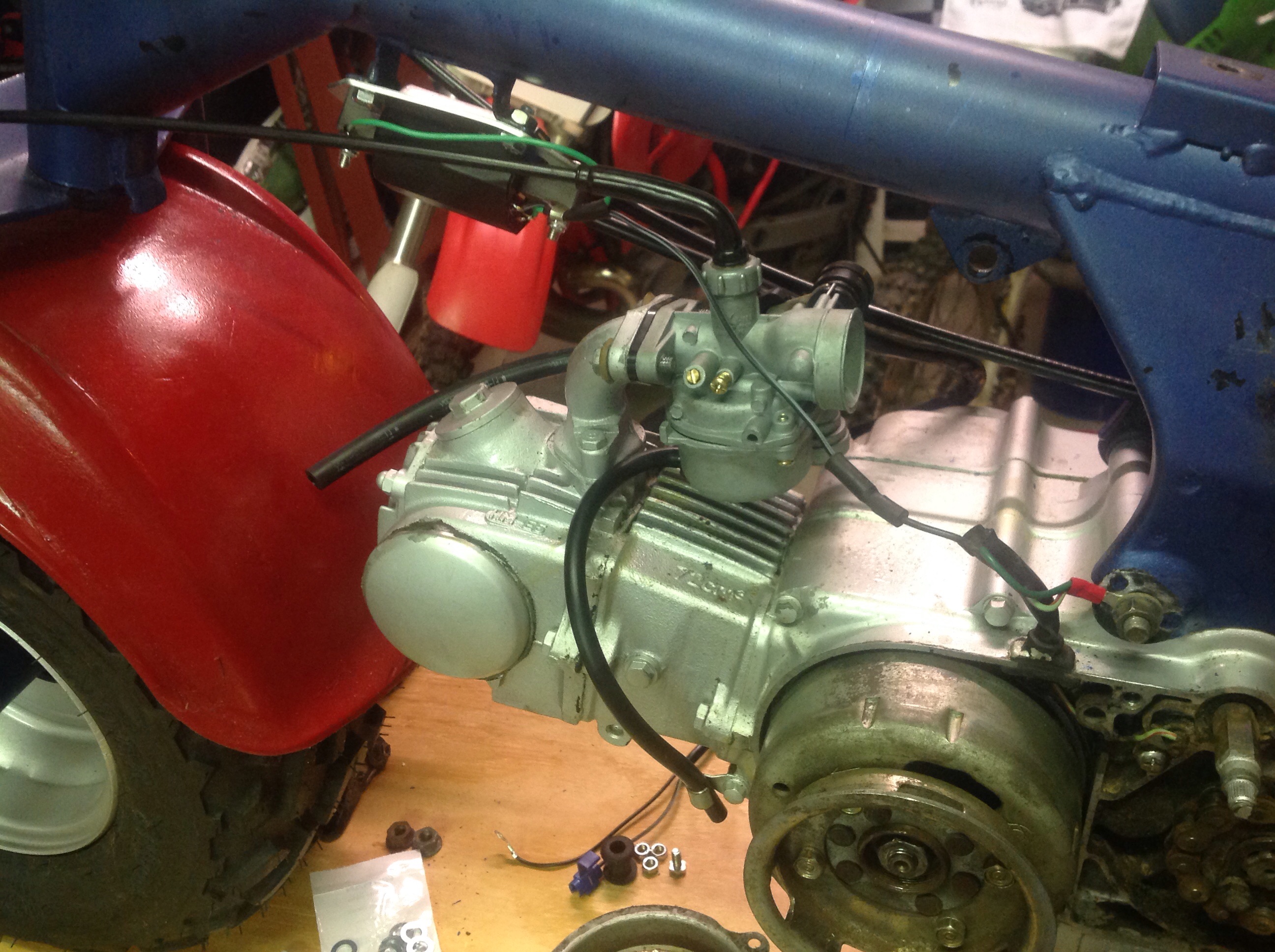 Anyways, If you ground the stator directly to the bolt like shown, I think you would eliminate the neutral safety from the circuit. I think the dark green from the stator should be wired to the white/red wire from the neutral safety switch with an inline connector not attached to the frame. Then, when it is in neutral, the safety switch completes the ground path. (you can check the operation of the neutral safety by doing a simple continuity test with the red/white wire and a ground point. In neutral = continuous, in gear = not continuous) While you're at it, I would check all the grounds in the system to make sure they work properly. this includes the kill switch and grounds on ignition coil. All grounds should link with the ol continuity test. A lot of times, no spark is simply a kill switch prob (kill switch output wire should only go to ground when in "off" position.)