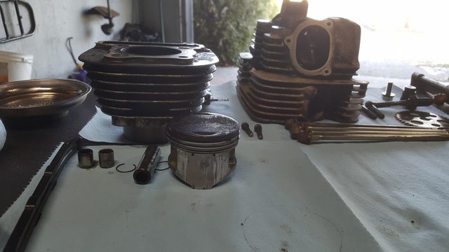 So yeah, In order to do any of that, I need to put it back together, but when I took it apart, old seized bolts broke (only two of them so far, but both in the head, one for the exhaust and one on the cover. I probably need a better pair of vise-grip as the blue wrench failed. Figured that I might as well go deeper as I'll most likely have to drill it out and check the state of the piston while I'm doing that... Mistake #1.