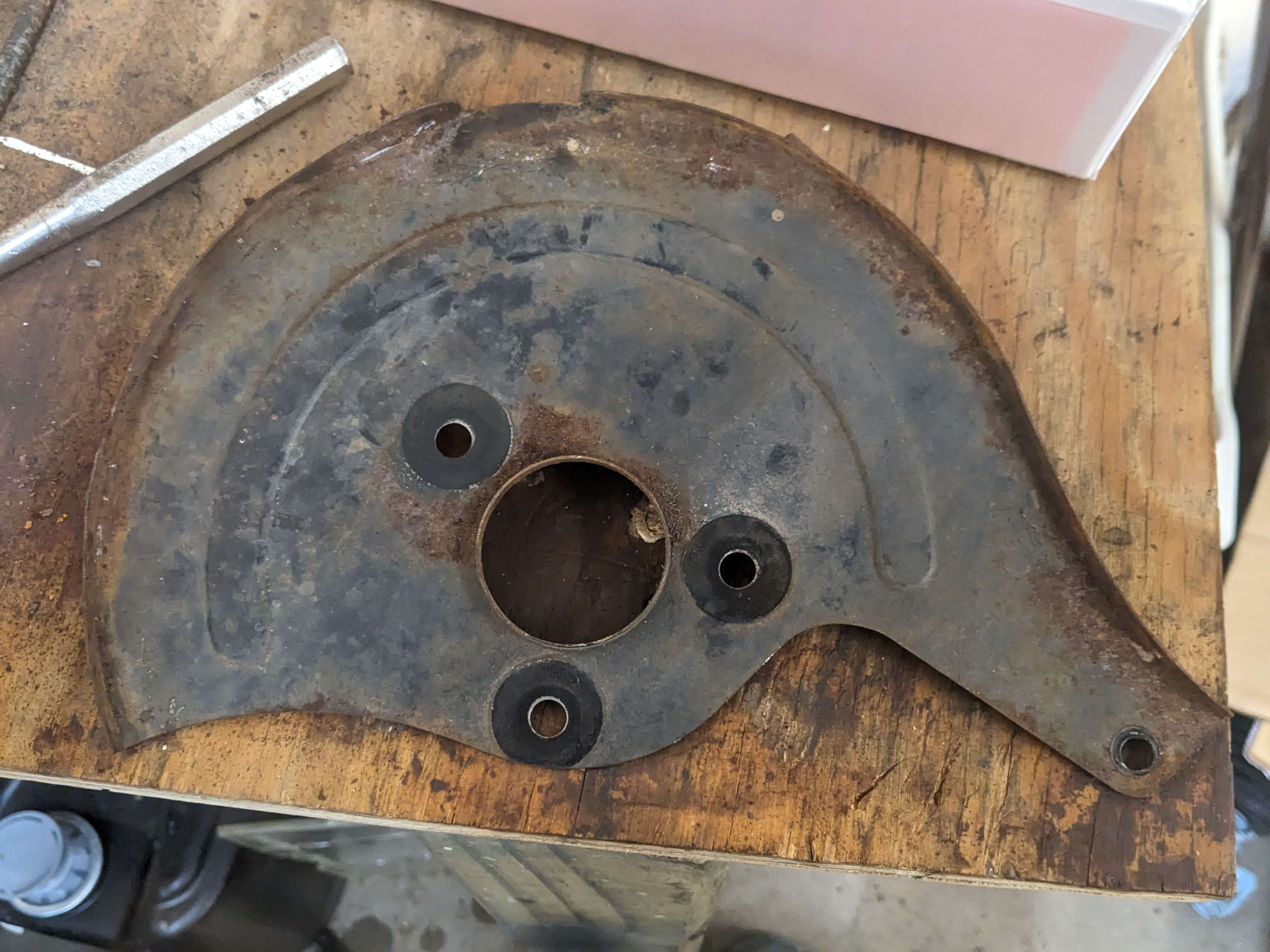 With the brake assembly off I was confronted with some bent and battered backing plates. The chain backing plate came off easily, but the drum backing plate has been welded onto the skid plate, which is all welded into the rear grab bar through someone's homemade tow hitch installation. It's ugly but I'm not ready to undo all of that, so I carefully took it all off in one piece.