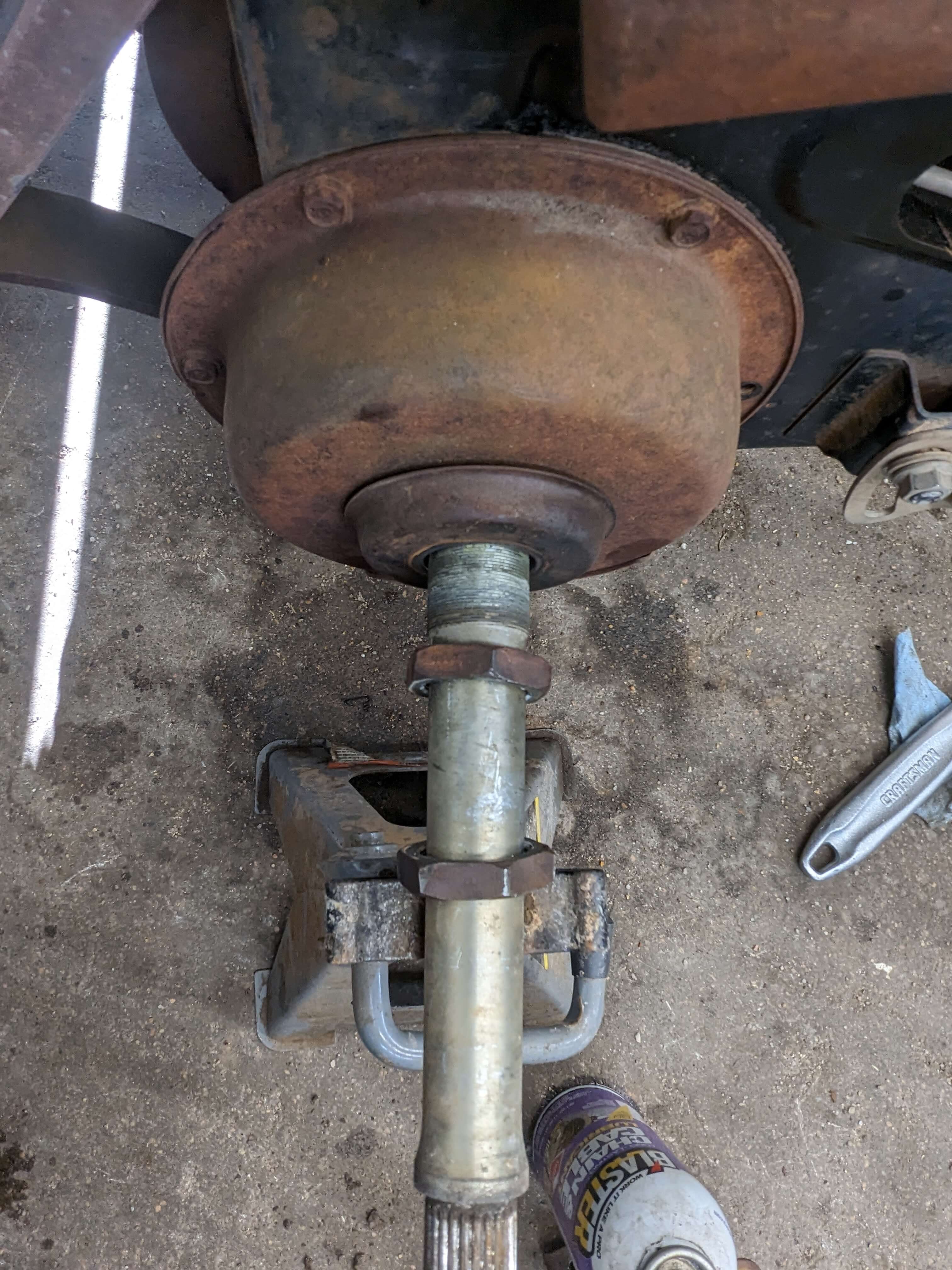 Pulling the hub took more work than it should have, mainly due to the addition of a trailer hitch/tow hook on the back of the 3 wheeler. Whoever added this was not gifted with welding skills, and it would seem that their weld slobber got on the brake drum backing plate as well as the skid plate. As such, while chain backing plate came off without issue, removing the brake drum backing plate involved unbolting the headlight mount as well as the skid plate and maneuvering the whole assembly off the shoe pivot and off the bottom of the 3 wheeler. A bit of a pain, but I'm not ready to remove the tow hook and clean all of that up yet, so this was the easiest method.