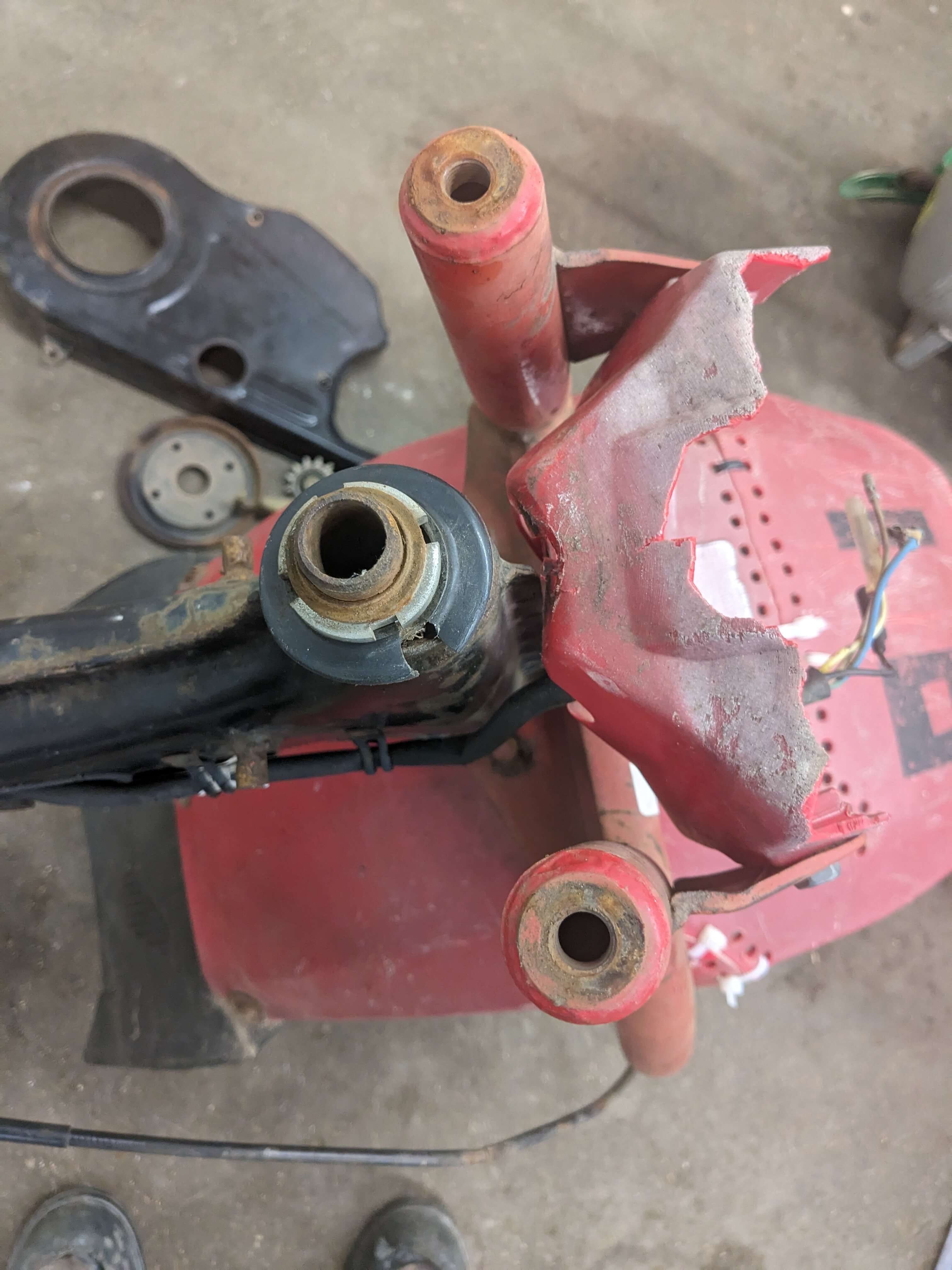 With the brake assembly off I was confronted with some bent and battered backing plates. The chain backing plate came off easily, but the drum backing plate has been welded onto the skid plate, which is all welded into the rear grab bar through someone's homemade tow hitch installation. It's ugly but I'm not ready to undo all of that, so I carefully took it all off in one piece.